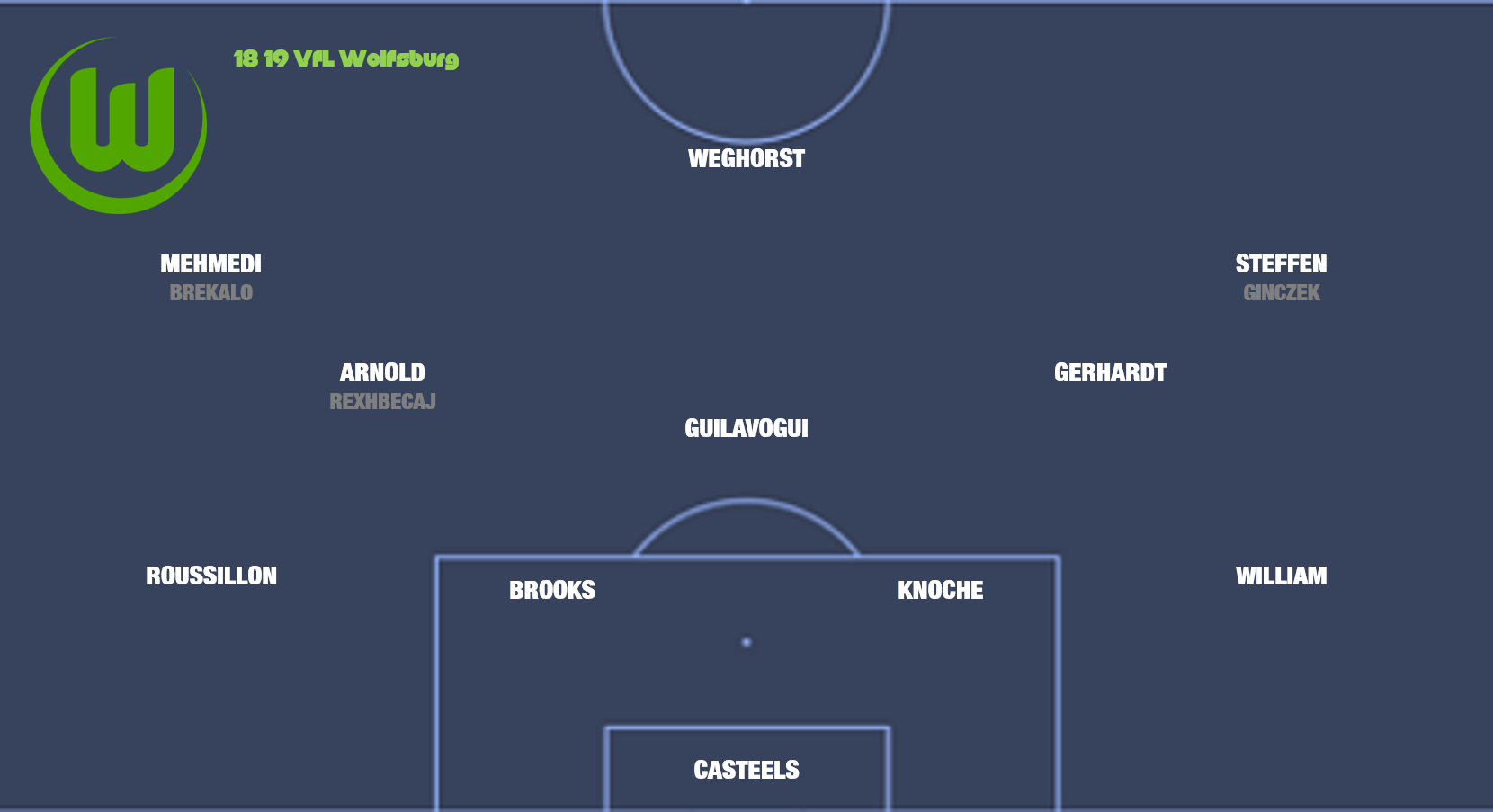 지난 시즌에 브루노 라바디아 감독이 지도한 VfL 볼프스부르크는 433 대형에 기반을 둔 "점유율 축구"를 첫 번째 경기 계획으로 활용했습니다. 쿤 카스테일스가 주전 골키퍼로 활약했고, 윌리앙과 로빈 크노헤, 존 앤서니 브룩스, 제롬 루시용이 최종 수비선을 구축했습니다. 역삼각형 중원에는 조슈아 길라보기를 중심으로, 야니크 게르하르트와 막시밀리안 아놀트가 포진했고, 주로, 레나토 슈테펜과 바웃 베흐호르스트, 아드미르 메흐메드가 전방 세 명의 공격수로 나섰습니다. 다니엘 긴체크와 요시프 브레칼로도 제법 많은 경기에 뛰었고, 허리에서는 엘비스 레즈베차이와 유누스 말르(지난겨울에 1. FC 우니온 베를린으로 임대 이적했습니다)가 주요 교대 자원으로 활약했습니다. 긴체크가 나올 때는 442 다이아몬드 대형에 가까운 운영을 선호했으나, 늘 그렇듯, 그가 부상으로 자리를 비운 기간이 너무 길어, 아쉬움이 남았습니다.