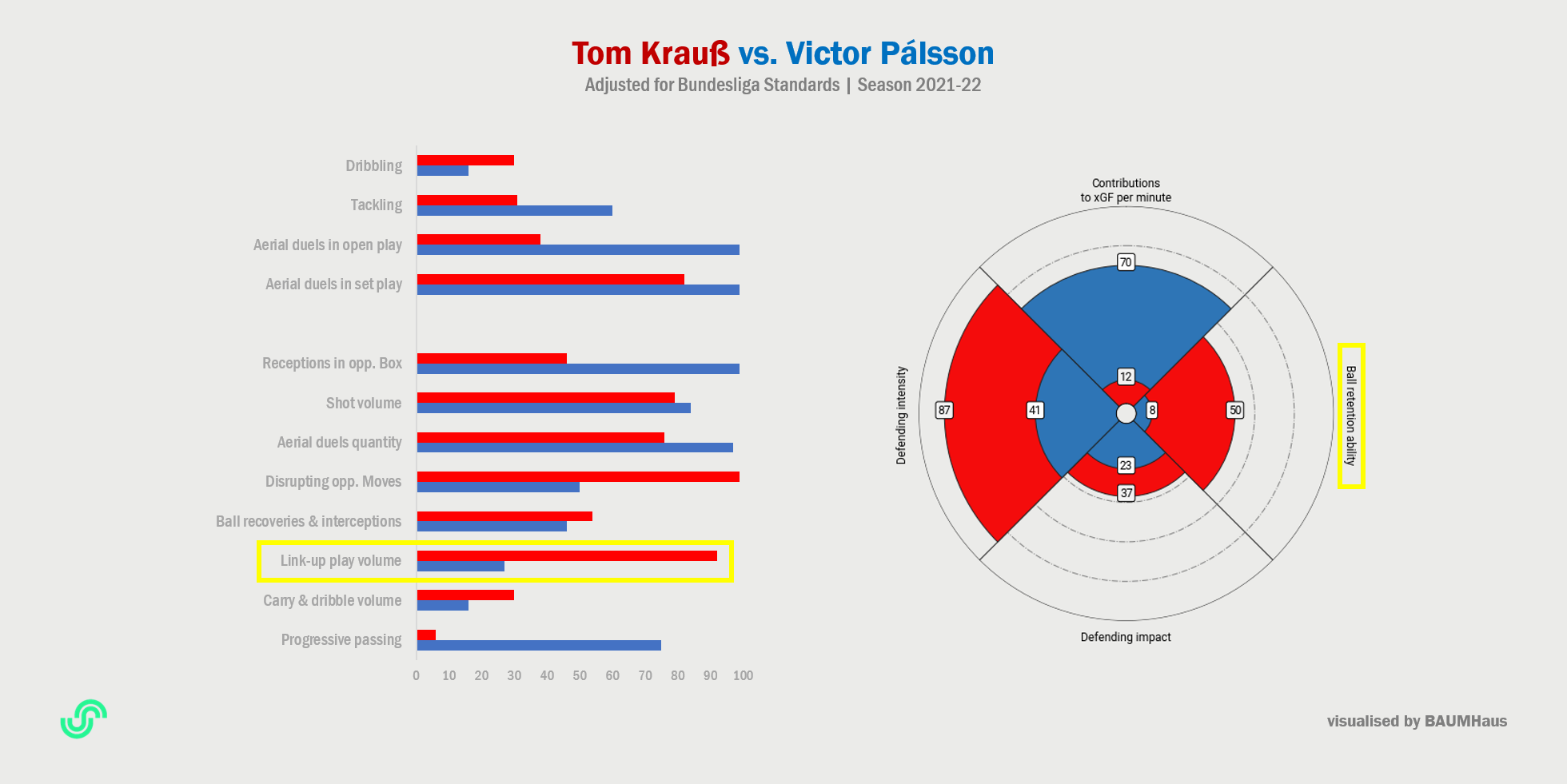 톰 크라우스보다 수비에서 기여도가 앞서는 2. 분데스리가 내 몇 안 되는 수비형/중앙 미드필더 중 하나인 빅토르 파울손에게는 그 이상의 무언가가 없습니다. 대단히 고전적인 수비형 미드필더로서, 신체적인 능력이 강하여, 공중에서 경합에 엄청난 승률을 자랑하고, 뒤쪽에서 넓은 공간을 책임지며 때로 공격에 가담하기도 하지만, 팀의 공격권 유지 및 창출에는 거의 도움을 주지 못합니다. 무엇보다, 뒤쪽에서 적재적소에 공을 보내는 능력이 현저히 떨어집니다. 디미트리오스 그라모지스 전 감독의 신임을 받았지만, 공격에서 부족한 파울손의 능력과 3322 대형에서 그를 보조해 줄, 그의 약점을 가려 줄 선수의 부재는 FC 샬케 04의 간격 유지와 유기적인 중앙에서 경기 운영을 방해하고 말았습니다. 가뜩이나 좋은 날과 안 좋은 날의 차이가 크고, 2. 분데스리가에서조차 "최고의 수비형 미드필더"로 꼽히지는 못하는 파울손이 압박의 강도가 매우 큰 분데스리가에서 주전으로 나선다면, 과연 얼마나 버틸 수 있을지 의문입니다. 이제 반대로, 크라우스는 파울손이 갖지 못한 능력을 보여 주어야 합니다. 지난 시즌까지 2. 분데스리가에서 모습을 본다면, 아직 확신을 심어주는 수준까지는 아니지만, 그 가능성에 기대를 걸 만합니다. 1. FC 뉘른베르크에서 공격의 줄기를 풀어주는 역할은 요하네스 가이스가 도맡았습니다. 상대적으로 부족한 크라우스의 공격 진영 삼분의 일 지점으로 패스 숫자는 그러한 배경을 갖습니다. 주목할 점은, 공격 진영 삼분의 일 지점으로 패스 숫자가 가이스의 40%에 그쳤는데도, 90분당 상대 수비진에 균열을 내는 창의적인 패스("Smart pass")의 숫자는 크라우스(0.32회; 가이스는 0.19회)가 앞섰다는 사실입니다. 앞서 잠시 언급한 요주아 키미히에 비할 바는 못 돼도, 크라우스가 FC 샬케 04의 중원, 동료들의 뒤에서 좌우로, 앞으로 공을 보내주는 선수로서 (사실상 홀로 그를 담당하고도 크라우스보다 완전 낫다고 보기 힘든) 파울손을 앞설 수 있다고 기대하는 지점입니다. 2022-23 시즌의 종료 시점에 쾨닉스블라우엔과 크라우스의 계약이 분데스리가 잔류/강등 싸움에 결정적인 하나의 사건으로 남을지는 알 수 없습니다. 제바스티안 바실리아디스(DSC 아르미니아 빌레펠트)처럼, 2. 분데스리가에서 매우 좋은 활약을 펼치고도 분데스리가에서 성공하지 못한 미드필더도 적지 않습니다. 크라우스는 과연, 분데스리가에서도 자신의 진가를 드러내며 자신을 비교적 적은 대가에 포기한 RB 라이프치히 관계자들을 후회하게 만들지, 안토니오 디살보 감독의 팀을 넘어, 월드컵 전후에 한지 플리크 감독의 관심을 끌 수 있을지 주목됩니다. 선수에게는 무궁한 잠재력이 있습니다.