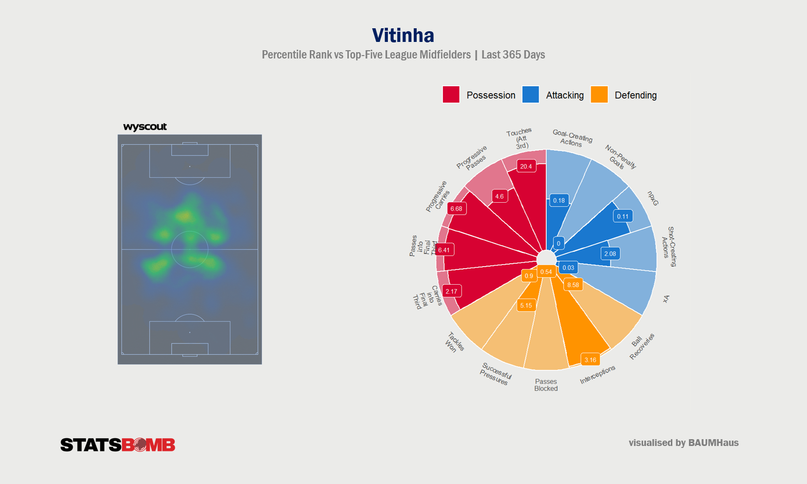 수비진 맨 뒤, 최후방에 세 명의 선수를 배치하는 대형의 활용은 가장 직관적으로 드러나는 변화입니다. 마우리시오 포체티노 전 감독이 현대 축구에서 그 경계가 점차 허물어지는 433 대형 또는 4231 대형을 즐겨 쓴 데 반해, 크리스토프 갈티에 신임 감독은 3421 대형을 주력으로 밀고 있습니다. 이는 이번 시즌, 건강하게 복귀한 세르히오 라모스와 프레스넬 킴펨베가 가운데, 마르키뉴스의 엄호를 받으며, 각자 공 다루는 기술을 뽐내고 측면의 공격적인 선수를 도와, 측면에서 숫자 싸움에 우위를 가져다주는 전술 환경을 최적화합니다. 아슈라프 하키미(오른쪽)와 누누 멘드시(왼쪽)는 좌우 날개를 책임지며 수비 시에는 523 대형으로 변화의 핵심이 되고, 공격 시에는 공격 지역 최종 삼분의 일 지점에서 폭을 제공하거나 안쪽으로 침투하여 페널티 구역 타격을 적극적으로 지원합니다. 모두가 각자 재능을 펼치고 있지만, 이러한 체계로 변화의 열쇠가 된 선수는 정작 포르투갈 출신, 스물둘의 신입 미드필더, 비티냐입니다. 비티냐는 그 이전에 안데르 에레라(역시 올여름에 아틀레틱 클루브로 임대 이적했습니다; 추후 완전히 이적할 수 있도록 하는 조항에의 합의가 있었습니다)나 이드리사 게이 등이 갖추지 못했던, 공을 가까이 있는 동료에게 넘긴 뒤에 공간으로 움직이는 경기에 강점을 보이며, 3선에서 마르코 베라티의 혹사와 지난 시즌, 리오넬 메시를 그의 위력이 아무래도 반감하는, 깊은 곳으로 자꾸만 내려오게 만들었던 팀의 문제를 해결하는 중입니다. 여담으로, 패스를 잘하는 레안드로 파레데스조차도 공을 발끝에서 떠나보낸 직후의 움직임은 그리 좋지 못했습니다. 비티냐는 비록 상대 수비선을 한 번에 허무는 공을 자주 보내거나, 홀로 엄청난 중원 장악력을 과시하는 유형의 선수는 못 되지만, 그의 전임들과 달리, 베라티가 뒤쪽에서 일차적인 팀 공격의 조립을 맡을 때 상대 압박을 벗겨내도록 돕고(그 반대가 되기도 하고), 메시가 기초적인 문제, 팀 허리의 문제에 이전보다 신경을 덜 쓸 수 있도록 해줍니다. 어떤 면에서는 실로 역동적이라고 표현할 수도 있는 그의 이러한 경기가 전술하기도 한, 파리 상제르망 FC가 블레즈 마튀디(현 클루브 인테르나치오날 데 푸트볼 마이애미 소속 미드필더)가 최고 기량을 자랑하던 시기 이후로 꾸준히 찾아 헤맨 '중원의 유기성 강화'에 크게 역할을 하는 오늘입니다.
