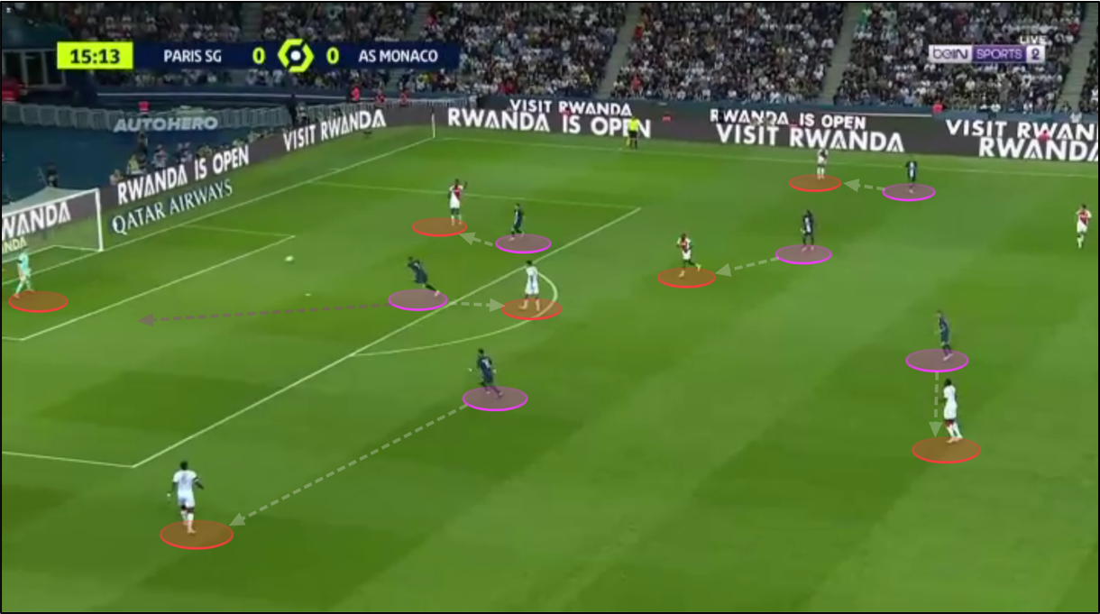 끝으로 크리스토프 갈티에 감독이 지휘하는 파리 상제르망 FC의 수비 시 경기 방식을 짧게 살피면, 전방 압박 시에는 대인 방어에 기초하여, 뒤쪽에서 공 잡는 상대 선수가 생각할 여유를 주지 않습니다. 왼쪽, 1 대 1로 비겨, 팀이 이번 시즌, 유일하게 이기지 못한 AS 모나코 FC와 경기 중 장면에서도 브누아 바디아실이 알렉산더 뉘벨에게 내려주는데, 기예르모 마리판은 킬리안 음바페가, 악셀 디사시는 네이마르가 잡고, 카이우 엔히키는 아슈라프 하키미가, 무함마드 카마라는 헤나투 산시스, 유수프 포파나는 마르코 베라티가 맡습니다. 리오넬 메시가 바디아실에게 아주 가까이 붙기 전에 포파나가 그의 동료 수비수에게 손짓하긴 했지만, 왼발에 의존하는 바디아실이 그를 보지는 못했습니다. 뉘벨은 공을 잘 다루는 골키퍼입니다. 양발을 자유자재로 쓰는 그보다 지난 일 년간, 공격 전개에의 기여도가 큰 골키퍼는 유럽 최고 다섯 개 대회(프리미어 리그, 라리가, 세리에 A, 분데스리가, 리그 1 등) 내 거의 없습니다. 하지만, 이 다음 장면에 공을 받은 그에게는 엄청난 압박이 가해집니다. 그에게 쏜살같이 달려드는 공격수가 음바페인지라, 사실상 공을 잡자마자 방출해야 했습니다. 결과적으로 공은 높이(화면 밖으로) 올라가 있던 루벤 아길라르를 향하는데, 누누 멘드시가 따라붙을 때 아길라르의 머리 위를 그냥 지나가고, 이후 케빈 폴란트가 따라붙었지만, 프레스넬 킴펨베에게 곧바로 견제받으며, 공을 지키지는 못했습니다. 옆줄 바깥으로 공이 나가면서, 파리 상제르망 FC가 던지기 공격으로 이어갑니다. 그나마 공 잡은 선수가 뉘벨이라 비슷하게나마 날아갔지만, 공다루기를 두려워하는 골키퍼가 음바페의 직접적인 도전을 받았다면, 대형 사고가 발생할 수도 있었습니다. 여기서 보듯, 파리 상제르망 FC의 높은 위치에서 대인 방어에 기반한 압박은 위협적일 수 있습니다. 그는 곧 이곳에서 공을 끊자마자 골을 바라보는 선수가 다시 메시, 음바페, 네이마르라는 점에 의해 두드러지기도 하지만 말입니다. 높은 위치에서 압박이 소득을 거두지 못하면, 오른쪽 장면에서처럼 523 형태에 가깝게 내려앉습니다. 하키미와 멘드시가 맨 뒤, 세 명의 중앙 수비수 중 양 끝에 서는 세르히오 라모스, 킴펨베(때로 다닐루 페레이라가 밑에 서기도 합니다)의 옆으로 이동해, 최종 수비선을 완성합니다. 중앙선 위에서와 아래에서 기본적인 규칙은 이렇게 고정돼 있습니다. 열쇠는 늘 그렇듯, 메시와 네이마르가 수비에 얼마나 깊이 도움을 줄 수 있을지(둘이 무관심하게 놓아 버리면, 상대가 정신없이 방향을 바꾸며 흔들 때, 베라티와 비티냐, 혹은 산시스 등, 가운데에 서는 미드필더들의 부담이 너무 커집니다)와 그 중간, 전환기에 어떻게, 얼마나 효과적으로 지연 행위를 할 수 있을지에 달렸습니다. 결국, UEFA 챔피언스 리그, 특히 높은 단계로 향할수록, 파리 상제르망 FC를 상대하는 팀이 그를 더 집요하게 공략할 수 있기 때문입니다. 시즌 초반, 아주 좋은 흐름을 타는 갈티에 신임 감독과 팀이 과연 내년 여름쯤에는 그 숙원 사업(UEFA 챔피언스 리그 우승)을 풀 수 있을지 주목됩니다. 재료와 큰 틀의 조리법은 준비됐습니다.