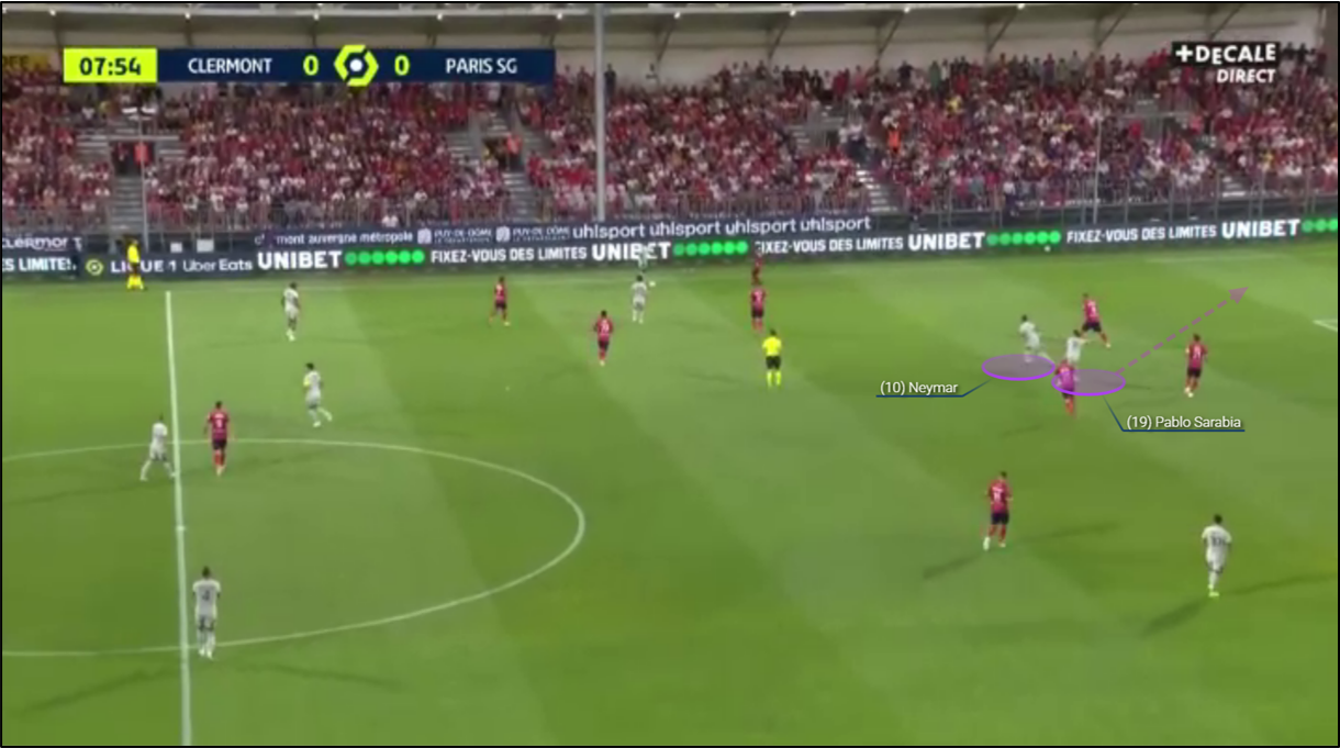킬리안 음바페가 자리를 비웠던 FC 낭트와 트로페 데 샹피옹 경기(4 대 0으로 승리), 클레르몽 푸트 63와 리그 1 개막 첫 경기(5 대 0으로 승리), 그리고 네이마르가 교체 명단에서 출발한 FC 낭트와 리그 1 6라운드 경기(3 대 0으로 승리) 등, 단 세 번뿐이었지만, 파블로 사라비아가 선발 출전하는 날에는 공격진의 또 다른 호흡을 볼 수 있습니다. 그는 아직, 이번 시즌 첫 번째 공격 포인트를 기록하지 못했지만, 메시, 음바페, 네이마르 등과는 또 다르게, 발밑에 공이 없을 때 적극적으로, 희생적으로 움직이면서 윤활유가 돼 줍니다. 클레르몽 푸트 63와 경기 중 나온 위 장면, 사라비아의 움직임이 결과적으로 골을 만들었다고 해도 과언이 아닙니다. 왼쪽 측면, 옆줄 부근에서 누누 멘드시가 공을 잡았는데, 직접 그를 넘겨받고 무언가를 만들기 위해 멘드시의 가까운 거리로 움직이는 네이마르와 달리, 당장 공을 받든 못 받든 공간을 파고들어 '지금' 공을 잡은 멘드시의 선택지를 늘려주기 위해, 사라비아는 수비수 두 명 사이, 상대 최종 수비선 뒤로 달립니다. 멘드시는 사라비아에게 공 보내기를 택합니다. 그리고 그가 통과되자, 네이마르는 곧장 뒤를 돌아서 페널티 구역으로 향합니다. 사라비아는 공을 잡았지만, 골대와 각도가 거의 없다 보니, 직접 해결할 수는 없었습니다. 가운데로 그를 넘겼고, 역시 오른쪽에서부터 달려들어 온 메시의 발에 한 번 맞은 공은 네이마르에게 떨어져, 그의 골로 완성됐습니다. 앞서도 짤막하게 언급했지만, 음바페와 네이마르의 동선은 겹칠 때가 많습니다. 두 선수 모두 경기장 왼쪽으로 빠지기를 선호하는데, 멘드시가 폭을 제공하다 보니, 그 범위가 한정되는 탓도 있지만, 아무래도 각자 '자기' 발밑에 공을 붙이고 경기하기를 원하는 까닭입니다. 가뜩이나 협소한 공간을 더 효율적으로 공략하기 위해서는 그러한 쓸데없는 낭비를 막아야 합니다. 방법은 사라비아가 위 장면에서 보여주었듯, 한 선수가 공을 받기 위해 움직인다면, 다른 한 선수는 확률이 조금 떨어지더라도, 직접 해결하겠다는 욕심은 잠시 내려놓고, 희생적으로 움직여 주기입니다. 경기를 거듭하며, 이번 시즌, 파리 상제르망 FC를 기다리는 경기의 난이도는 상대를 불문하고 높아 갑니다. 11월에 있을 2022 FIFA 월드컵 카타르나 꾸준한 경기 출전에 따른 불가피한 피로 누적 등으로 선수들의 체력이 떨어지고, 시즌 개막과 함께 "상식을 벗어난" 공격 포인트 쌓기 행진하던 네이마르가 이달 들어 조금 그 수준이 내려왔듯(여전히 어마어마하지만), 누구에게나 골과 마루가 있습니다. 팀이 진정 결과 내기를 바라는 그 시즌의 후반부에도 지금과 같은 수준의 공격 파괴력을 자랑하려면, 이러한 아주 작은 부분에도 더 주의를 기울여, 다듬고, 완성도를 높이려는 노력이 필요합니다.