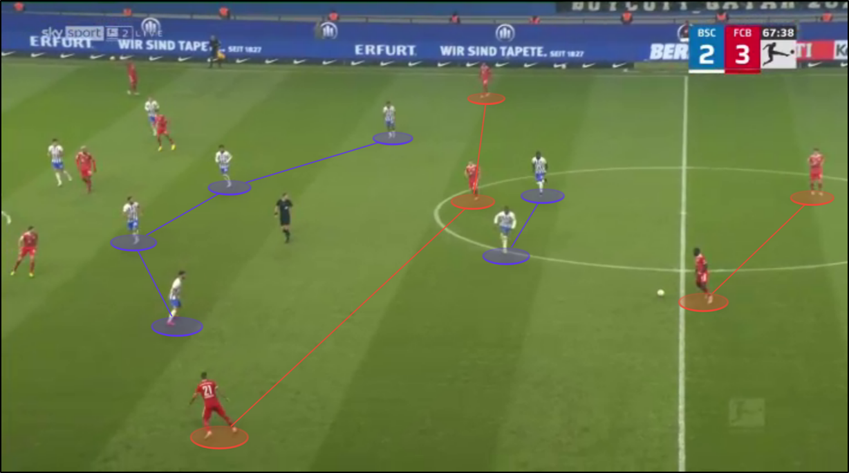 이렇듯, 잔드로 슈바르츠 감독이 그 전술적인 창의성을 뽐냈지만, FC 바이에른 뮌헨의 율리안 나겔스만 감독도 손 놓고 당하기만 할 인물은 절대 아니었습니다. 전반전, 분데스리가 최강 클럽의 계획대로 경기가 잘 풀렸다고 보기는 어렵습니다. 3 대 2의 점수판을 뒤로하고, 경기 내용 면에서 그들이 원하는 만큼 압도적인 모습에, 많은 기회를 만들지 못했습니다. 뒤쪽에서 포문을 열 때, 요주아 키미히가 가운데 중심축으로 버티고, 누사이르 마즈라위가 오른쪽에서 높이 위치할 때, 왼쪽의 알폰소 데이비스가 전진 시기를 늦춰, 방자망 파바르, 다요 우파메카노 등과 서로 요동할 수 있는 구조의 접합 부분으로 남았습니다. 헤르타 BSC가 종종 전방에서 압박의 강도를 높이곤 했지만, 442 대형으로 두 줄이 내려앉을 때는 원정 팀의 맨 뒤 "31 대형"이 숫자상 '낭비'가 됐습니다. 홈 팀은 키미히가 공을 잡으면, 뤼카 투자르 등, 키미히보다 신체적인 조건이 좋은 미드필더를 통해 그를 견제했습니다. 키미히가 개인 능력으로 잘 싸웠지만, 조금은 답답한 전반전 흐름이 이어졌습니다. 실수가 종종 나왔고, 그는 곧 도디 루케바키오를 앞세운 홈 팀에 좋은 역습 기회를 제공, 때아닌 실점 위기로 이어질 수 있었습니다. 중간 쉬는 시간을 지나, 나겔스만 감독은 팀이 "23 형태"로 일차 공격 조립에 나서게 변화를 줍니다. 키미히 양옆으로 마즈라위와 데이비스(데이비스가 허벅지 뒤 근육을 잡고 나간 뒤에는 루카스 에르난데스)가 서고, 파바르와 우파메카노가 헤르타 BSC 최전방 둘의 압박을 견디도록 했습니다. 파바르가 종종 실수를 저질렀지만, 그를 제외하면, 이는 원정팀의 후반전 공 점유율을 더 높이는 결과(전반전 69%, 후반전 74%)를 불러왔습니다. 전체적인 선이 올라가, 전반전, 지키는 골대로부터 평균 거리가 54.7m 정도였던 FC 바이에른 뮌헨은 후반전, 그 숫자를 60.1(m)까지 키웁니다. 세 골 차로 뒤지던 경기를 순식간에 한 골 차 승부로 돌려놓은 헤르타 BSC가 결국은 제풀에 무너지도록 하기 위함이었는데, 측면에서 연계가 비교적 살아나면서, 특히 오른쪽에서 가운데로 넘기는 공으로 기회를 잡았습니다. 슈프레아테너는 바스티안 당케르트 주심의 마지막 호각 소리가 나기까지 "한 골만"을 생각했지만, 그야말로 후반전 주도권을 손에서 놓지 않은 상대에 별 위협을 가할 수 없었습니다.