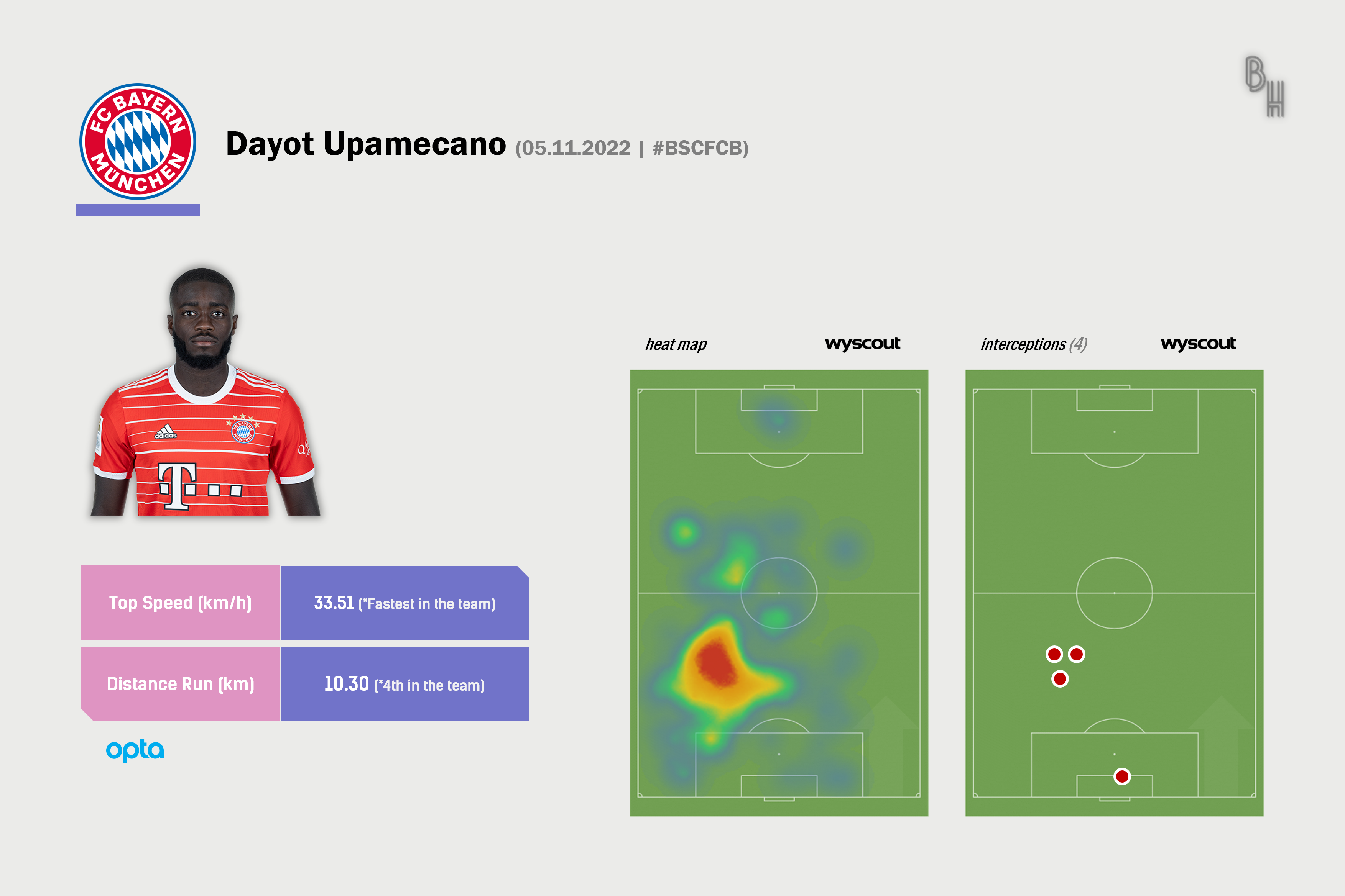 경기 최고 선수를 꼽으라면, 열의 아홉은 다요 우파메카노의 이름을 댑니다. FC 바이에른 뮌헨 수비선의 중심에서 우파메카노는 빼어난 실력을 뽐냈습니다. 홈 팀 중원의 핵인 뤼카 투자르(일곱 번 승리)와 같이, 가장 많은 열한 번의 수비 경합(여섯 번 승리)을 펼치며, 무려 23번이나 베를린 노파의 공격을 차단해 냈습니다. 후반 추가 시간, 극적인 동점 골을 갈망하던 홈 팀의 사실상 마지막 날카로운 공격을 막아낸 이도 바로, 우파메카노입니다. 네 차례, 공을 가로챘으며, 주인 없이 구르는 공에 여덟 번 도전해, 여섯 번, 그를 소유했습니다. 위치상, 또, 역습을 통한 한 방을 노린 헤르타 BSC의 큰 틀에서 경기 전략상, 우파메카노가 도디 루케바키오와 다투는 상황이 아무래도 많이 펼쳐졌는데, 최고 속도에서 조금 밀렸을지는 몰라도, 프랑스 국가대표 중앙 수비수는 무시무시한 힘으로 부딪으며, 벨기에 국가대표 공격수를 번번이 좌절시켰습니다. 백미는 홈 팀이 세 명의 선수를 교체한 직후, 후반 21분 무렵에 연출된 장면이었습니다. 공을 획득한 슈프레아테너가 빠르게 전환하며, 길게 공을 보내서 루케바키오가 그를 쫓게 하는데, 이때, 원정팀의 맨 뒤 수비선에서 그를 견제할 만한 선수는 우파메카노, 딱 한 명뿐이었습니다. 즉시 속도 싸움이 펼쳐지고, 우파메카노가 그에 이기지는 못하지만, 마지막 순간에 집중력을 발휘해, 정확히 공을 밀어내는 태클로 루케바키오를 저지합니다. 만일, 그의 시도가 무위에 그쳤다면, 루케바키오가 곧장, 마누엘 노이어 골키퍼와 일대일로 대치했고, 그로부터 동점 골이 연결됐다면, 안 그래도 불과 몇 분 전, 오프사이드 반칙으로 원정팀의 달아나는 골이 무효 처리된 마당에, 경기 분위기, 흐름 따위가 홈 팀으로 급격히 기울 뻔했습니다. 우파메카노의 이 수비가 어쩌면, 이 경기의 '끝'과 직결되는 매우 중요한 하나였던 셈입니다. 선수는 팀 공격의 기초 조립 공정에도 크게 이바지했습니다. 팀 내 가장 긴, 평균 22.2m의 패스 거리를 기록하면서도 가장 높은 약 92%(77/84)의 정확도를 자랑했습니다. 특히, 공격 지역 삼분의 일 지점을 향한 열 번의 시도에 모두 성공, 유일하게 그보다 많이 찬 요주아 키미히(13번 시도에 일곱 번 성공)보다도 더 자주, 전방 공격수에게 공을 연결했습니다. 당연히, 팀 내 1위. 조금은 기복을 보이던 시즌 초를 뒤로하고, 그야말로 물오른 기량을 자랑하는 우파메카노의 2022 FIFA 월드컵 카타르와 그다음이 기대됩니다. 적어도 이날, 베를린에서 그는 흠잡을 데 없는 활약을 펼쳐 보였습니다.