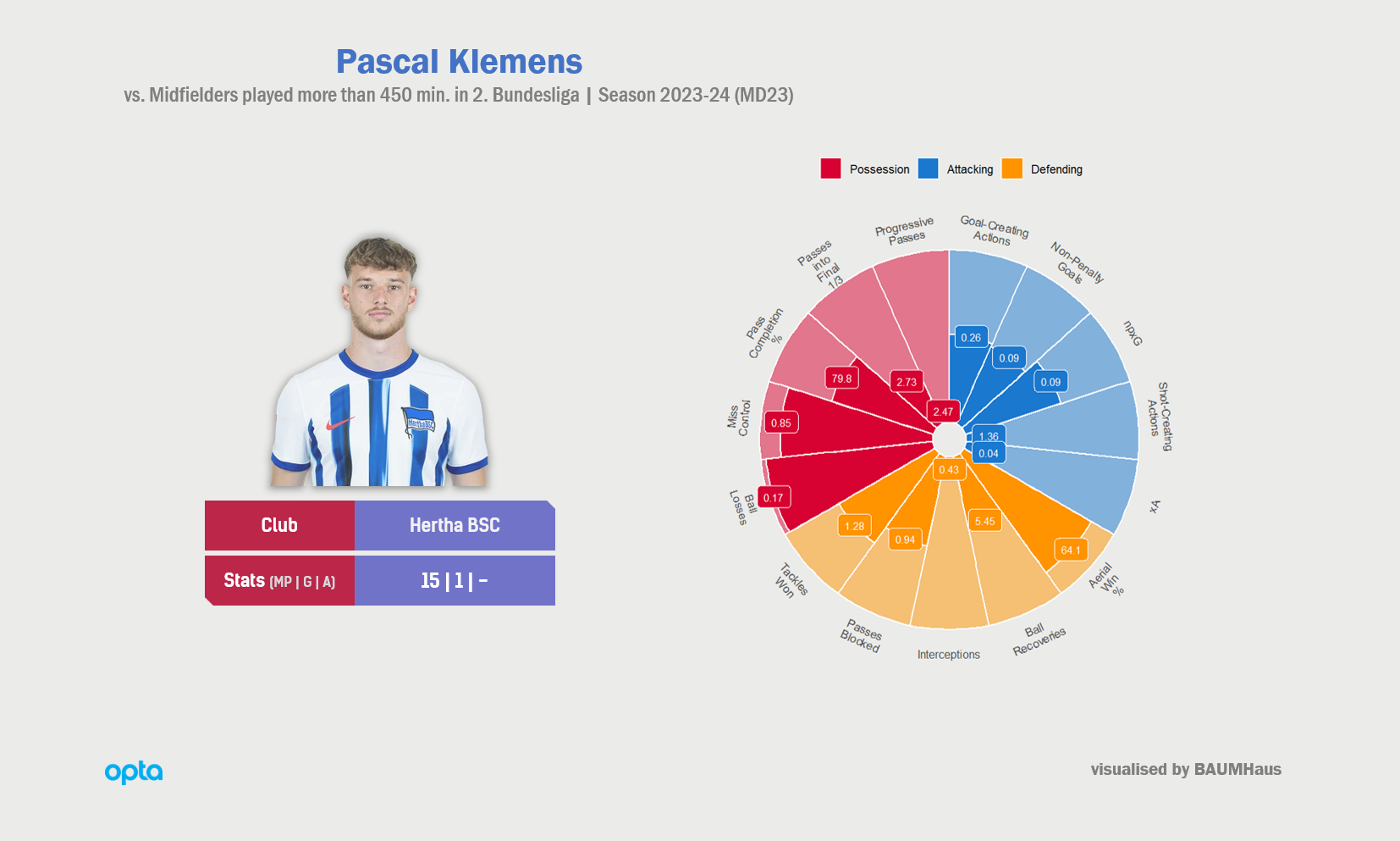 자신조차 "이렇게 빨리" 다르더이 팔 감독의 팀에서 자리를 잡을 줄 몰랐다고 말하는 파스칼 클레멘스를 올림피아슈타디온 베를린 오스트쿠어베는 "베를린의 길(Berliner Weg)"을 상징하는 선수 중 하나로 떠받듭니다. 아직 기복이 있고, 더 다듬어야 하지만, 어릴 적부터 그 공 다루는 감각이 한 살 손위 리누스 게히터보다도 발달했고, 언제나 '도전적인 경기'를 즐기는 클레멘스는 분명, 그의 준수한 공중 장악력, 물리력과 함께, 앞으로 헤르타 BSC 최종 방어선, 가운데 한 자리를 자기 담당으로 삼을 만한 재목입니다. 단, 이러한 그의 경기 성향과 강점 묶음은 그를 흥미로운 수비형 미드필더 유망주로도 보이게 합니다. "젝서(Sechser)" 클레멘스는 다시, 공중전에 강하고, 수비에 공헌하는 바가 클 뿐 아니라, 기초적인 공격 작업에 연결고리로서 도움을 줍니다. 팀이 때로 흔들리는 중에도 그는 지금 지나는 계절, 담담하게 프로축구 선수로서 그런대로 성공적인 (본격적인) 첫해를 보냅니다. '당장' 그의 '위치'가 그의 경력 내내 그가 어떤 선수가 될지를 정의하지는 않지만, 그가 만일, 남은 시즌, 안드레아스 부할라키스나 에이멘 바르코크를 대신하여, 베를린 노파의 허리를 책임지는 선수로서 입지를 굳힌다면, 그의 초기 계발에는 중요한 인자가 됩니다.
