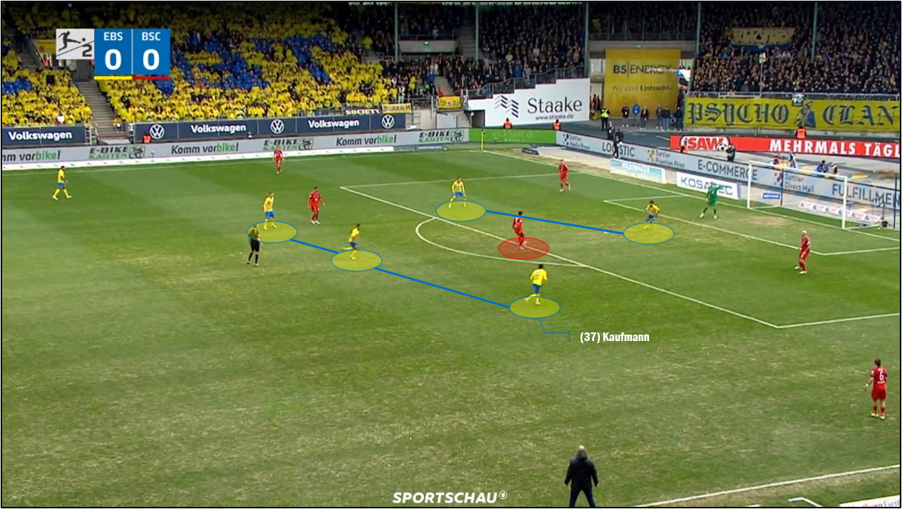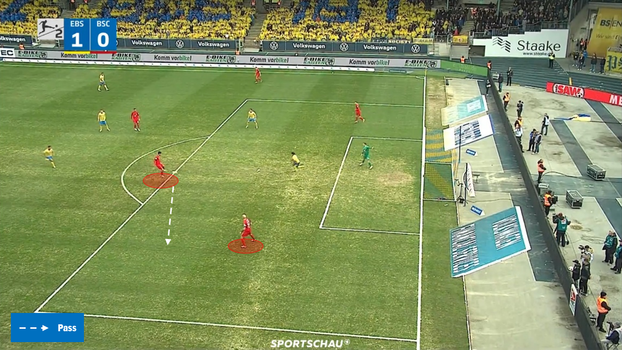 지난 주말, 브라운슈바이크 원정길에서 실책은 지난달 말일의 그와 다른 듯 닮았습니다. 이날, 안방에서 경기를 치른 브라운슈바이크의 사자들은 수비 시, 532 대형을 자주 만들었습니다. 전반 14분경, 뒤쪽에서부터 헤르타 BSC의 단위 시작, 안드레아스 부할라키스가 티아크 에언스트 골키퍼에게 공을 받던 때도 라얀 필리프와 조한 고메스, 소리르 요한 헬가손, 로빈 크라우세, 파비오 카우프만 등, (골키퍼와 맨 뒤 수비선의 다섯을 제외한) 다섯 명이 높은 곳에서 압박 임무를 수행했습니다. 부할라키스는 편안하게 공을 잡지만, 그가 공을 방출하는 즉시, 사자들이 그 목적지를 향하여 달려들 채비를 마쳤습니다. 그리스 출신 미드필더는 여기서도 (토니 라이스트너가 전진하여 공을 받기를 바랐으리라고 믿으나) 다소 "어처구니없게", 아무도 없는 공간, 굳이 이야기한다면, 고메스와 카우프만, 크라우세가 그린 삼각형을 벗어나지 못하는 곳에 공을 보냈습니다. 부지런히 달린 카우프만이 공을 잡고, "(필리프 칼로치보다도 더) 쉬운 골"을 작렬했습니다. 베를린 노파의 이 실점은 경기 초반, 팽팽하던 흐름을 한 번에 망쳐 버렸습니다. 마찬가지로, 부할라키스가 상대 압박의 구조만 파악했다면, 막을 수 있었던 일입니다.