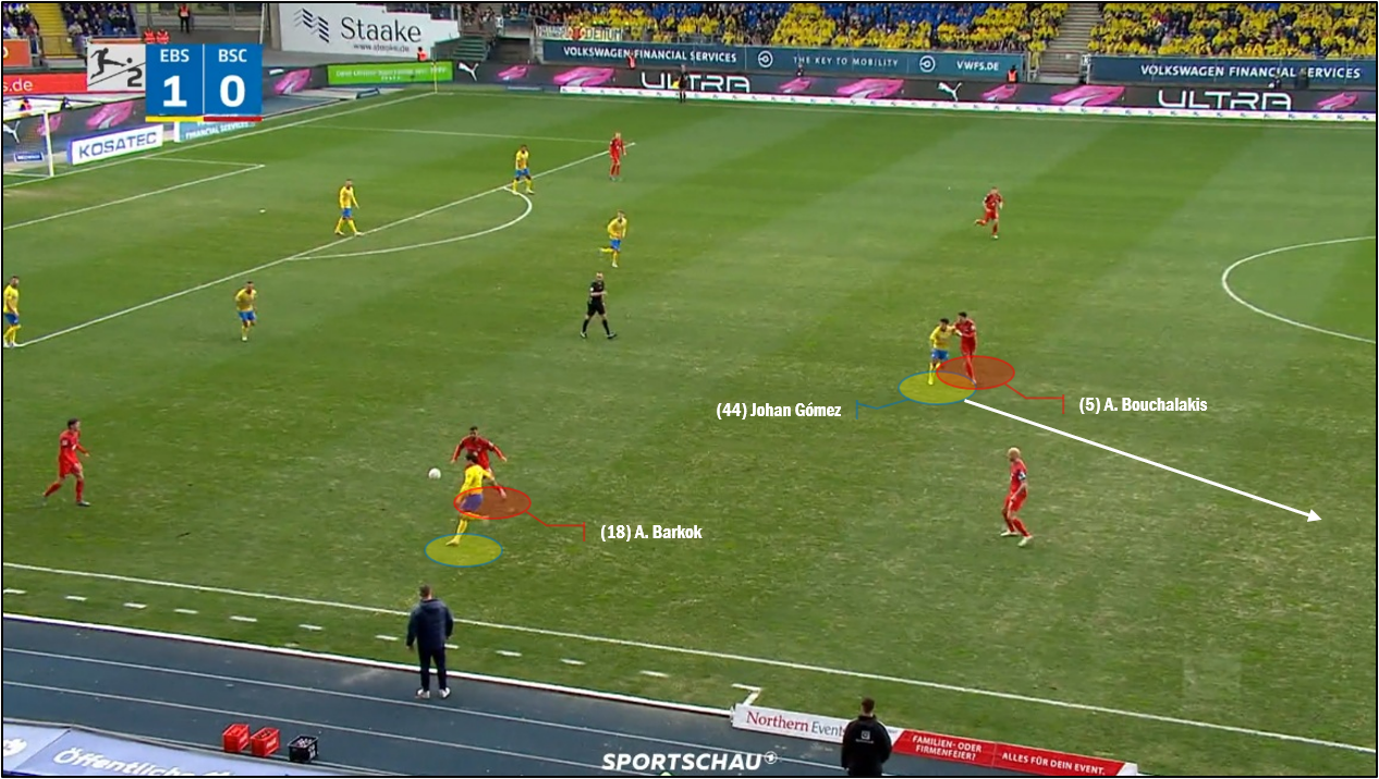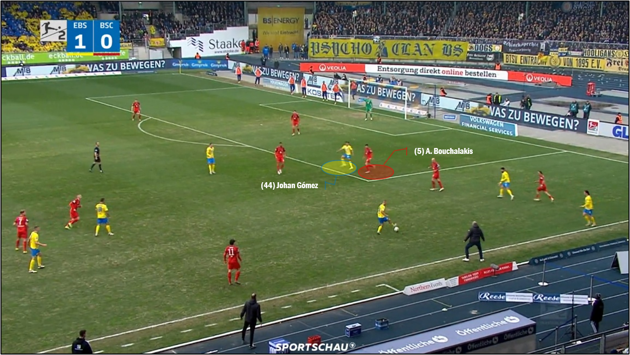 아인트라흐트슈타디온에서 안드레아스 부할라키스는 조한 고메스를 막는 데 자주 애를 먹기도 했습니다. 전반 40분경, 미하우 카르보프니크가 발이 꼬여 넘어지는 중에 공을 잃었고, 이를 마빈 리트뮐러가 아인트라흐트 브라운슈바이크 기준, 공격하는 진영, 오른쪽에서 아무런 방해도 없이 잡았습니다. 이때, 페널티 구역 안의 홈 팀 선수는 고메스가 유일했고, 부할라키스가 이번에는 자기 오른쪽 어깨 너머로 그의 존재를 확인했습니다. 부할라키스와 '거의 나란히' 붙어 있던 고메스는 리트뮐러가 공을 감아올리는 시점에 맞추어, (살짝 뒤로 빠졌다가 이내 방향을 바꾸어) 부할라키스와 파스칼 클레멘스 사이 공간으로 침투하는데, 여기서 부하는 제때, 적절히, 고메스를 따라 움직이지 못했고, 그 결과, 리트뮐러가 보낸 공이 '정확히' 고메스의 머리를 찾을 때, 고메스는 별다른 견제를 받지 않았습니다. 헤더가 골대 안을 향하지는 않았으나, 현장 지도부가 종종 사용하는 말처럼, "실점과 다름없는 장면"이었습니다. 자기 바로 뒤에 선수가 있다는 사실을 인지했고, 측면에서 공이 넘어온다면, 응당 그 표적이 될 만한 선수를 막아야 했는데, 부할라키스는 앞으로 나가려고 발을 뗐다가, 한두 걸음 늦게 고메스를 따르는 바람에, 그에 실패하고 말았습니다.