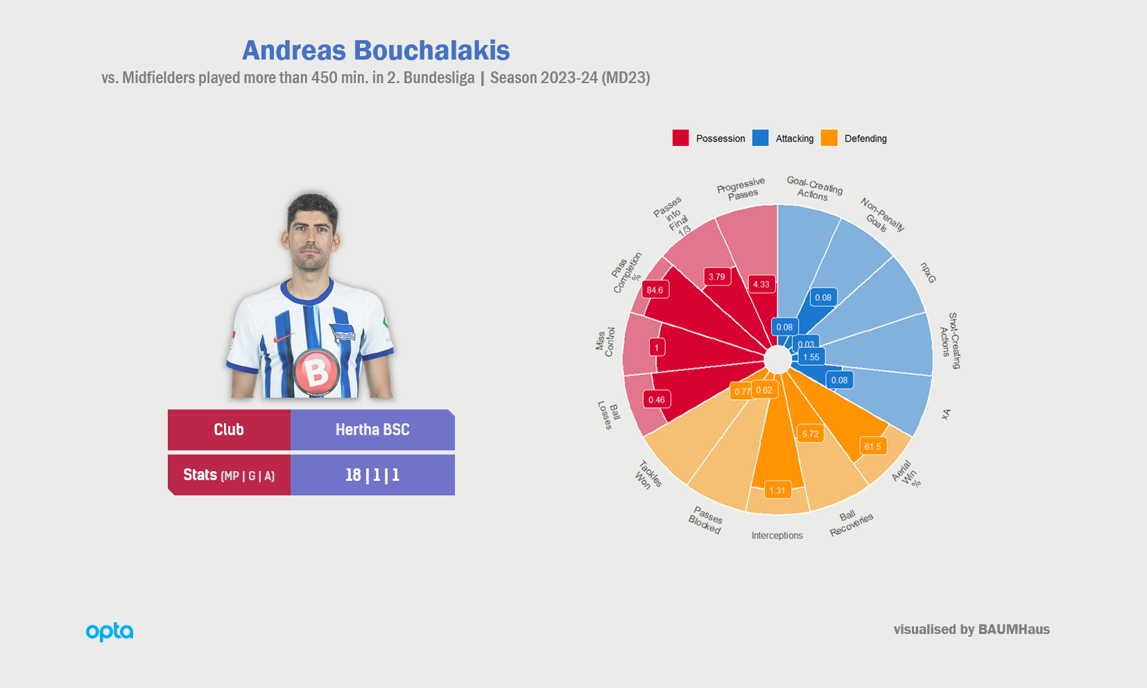 지난여름, 2. 분데스리가로 강등되고, 가까스로 클럽 면허를 유지한 뒤, 헤르타 BSC는 선수단 "대수술"에 들어갔습니다. 중원에도 변화의 바람이 불었으니, 케빈프린스 보아텡이 축구화를 벗고, 정든 잔디 위를 떠났고, 다르더이 팔이 감독과 사이가 나빴던 이반 슈니치(버밍엄 시티 FC)의 임대 계약이 종료됐으며, 장폴 보에티우스(무적), 톨가 지에르지, 뤼카 투자르, 수아트 세르다(엘라스 베로나 FC로 임대 이적) 등이 차례로 베를린 베스트엔트의 축구광 집단에 작별 인사를 남겼습니다. 사실상, '허리 분대'의 모든 얼굴이 떠났지만, 최악의 재정 위기 속, 새로운 선수를 영입하는 작업은 더디기만 했습니다. 독일 프로축구 차상위 대회에서 공이 먼저 구르기 시작했고, 다르더이 감독은 시즌 초반, 파스칼 클레멘스와 다르더이 마르톤 등, 중앙 수비수로 뛰는 편이 더 익숙한 선수들을 한 칸 위에 배치해야 했습니다. 애초, 왼쪽 측면 수비수로 분류됐던 제러미 두지아크도 고육지계에 동원되곤 했으며, 교체 명단에는 어린 파이트 슈탕에가 대기했습니다. 파시와 마르톤이 기대 혹은 우려보다 좋은 모습을 보였지만, 아무런 보강 없이는 장기전을 끌어갈 수 없었습니다. 이 극단의 상황은 여름 이적 시장의 문이 닫힐 때가 임박하여 완화했으니, 안드레아스 부할라키스와 빌랄 후세인이 2023년 8월 31일, 나란히, 헤르타 BSC의 파랗고 하얀 유니폼을 입었습니다.