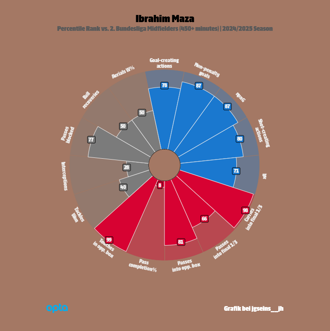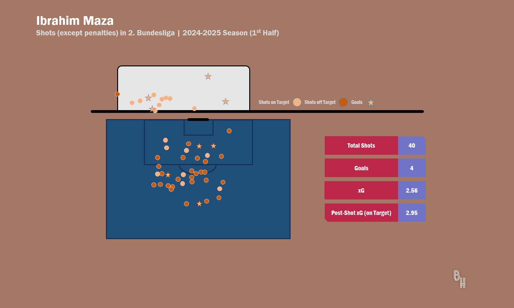 전통적인 배치에 따라 "아흐터(Achter; 8번 자리 중앙 미드필더)", "체너(Zehner; 10번 자리 공격형 미드필더)"로 나서지만, 본래 이보 마자는 공격수의 본능을 갖춘 선수입니다. 헤르타 BSC 유소년 학교에서는 최전방, 중앙 공격수로 대부분 경기 시간을 소화했습니다. 이번 시즌 전반기, 마자는 2. 분데스리가 17경기에 모두 선발 출전해, 다섯 골과 두 개 도움을 올렸습니다. 데리 셰어한트, 플로리안 니더레히너와 어깨를 나란히 하고 팀 득점 순위표를 이끌며, 총 공격 포인트 숫자(득점과 도움의 합)는 미카엘 퀴장스(네 골과 네 개 도움 =여덟 개) 바로 아래, 존조 케니(한 골과 여섯 개 도움 =일곱 개)와 같습니다. 3 대 1로 이긴 아인트라흐트 브라운슈바이크와 경기의 페널티킥 하나를 논외로 하고, 마자는 꼭 마흔 번(팀 내 최다), 상대 골키퍼를 시험했습니다. 눈에 띄는 점은 페널티 구역 안에서 시도(13번)보다 밖에서, 먼 거리에서 시도(27번)가 두 배 이상 됐다는 사실입니다. 골은 사이좋게 페널티 구역 안에서 둘, 밖에서 둘을 터뜨렸습니다. SSV 울름 1846 푸스발을 상대로는 골문으로부터 '무려' 26.73m 정도 떨어진 지점에서, '무려' 시속 118.65㎞로, '무려' 골대 오른쪽 위에 강하게 꽂히는 골로 쏟아지는 조명을 독차지하기도 했습니다. 니클라스 티데 골키퍼가 꼼짝없이 제자리에 얼어붙었습니다. 나름의 화려함도 보였고, 강한 발목의 힘도 보였지만, 정확도는 조금 더 높여야 합니다. 마흔 번의 슈팅 중 "유효 슈팅"은 단 열세 번, 유효 슈팅 전환률이 32.5%에 불과하니, 이는 마찬가지로 30번 넘게 상대를 위협한 셰어한트(15/35), 퀴장스(14/36)와 비교해도 떨어지는 수준입니다. 먼 거리에서 힘 조절에 실패해서 골대 위로 조금씩 뜨거나, 중간에 굴절되는 공까지는 어쩔 수 없다 하더라도, 골과 가까운, 페널티 구역 안에서만큼은 수비수에게 걸리거나 방향이 멀리 빗나가 버리는 빈도를 줄여야 합니다. 슈팅 직전까지 상황에 관심을 두는 기대 득점 값이 2.56골일 때, 슈팅 이후 상황, 그 자체의 질을 평가하는 유효 슈팅 내 기대 득점 값은 2.95골 수준, 그보다 컸습니다. 조금 더 정확하게 공을 보낼 수만 있다면, 그의 마무리 능력은 준수한 편입니다.