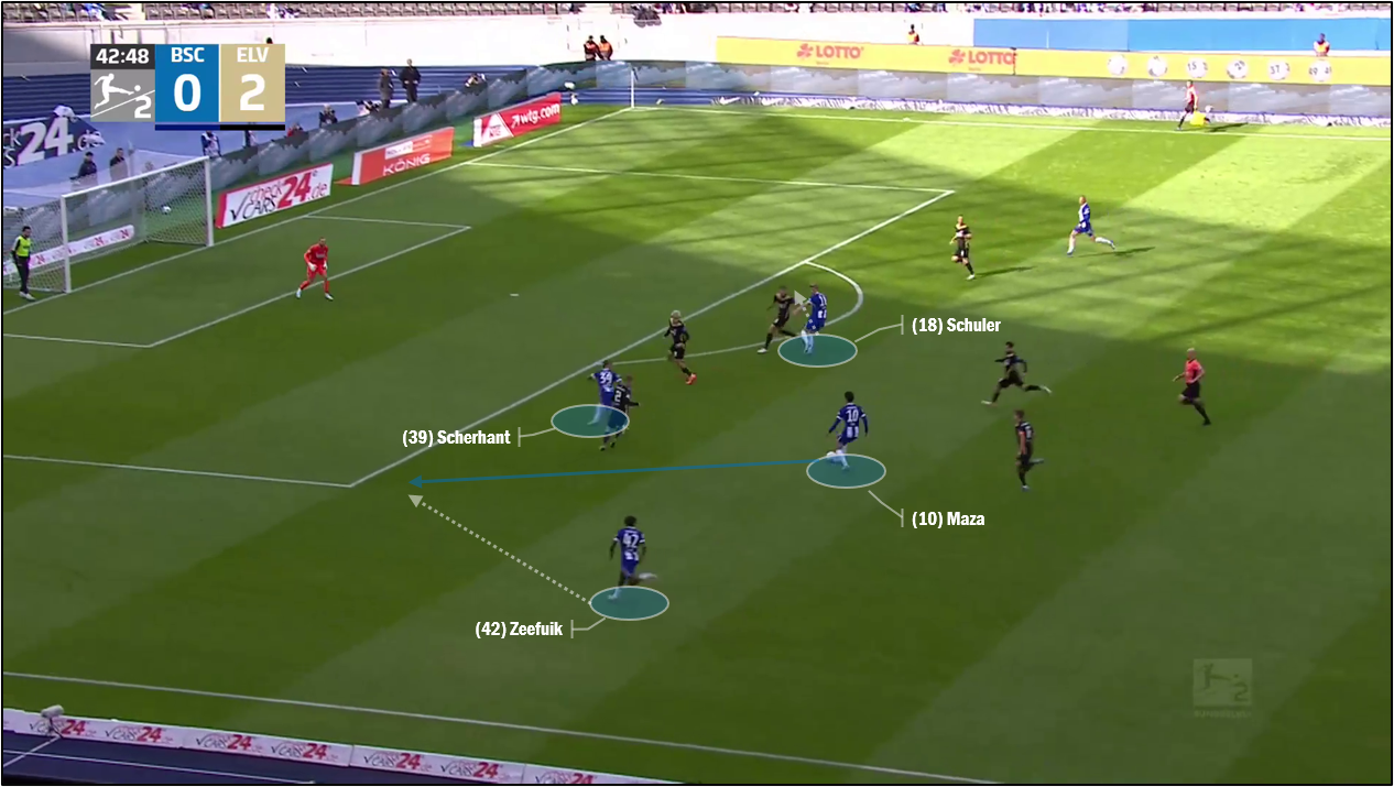 크리스티안 피엘 감독의 헤르타 BSC에서 이브라힘 마자는 전술적으로 아주 중요한 선수입니다. 뒤쪽에서 공격 단위 문을 열며, 팀은 주로, 좌우 측면 수비수를 아주 높이 올리지 않고, 양 측면 공간을 작게 반으로 나누었을 때 안쪽, 곧, 비교적 중앙에 가까운 공간에 놓습니다. 좌우 날개 공격수가 최대한 옆줄에 바짝 붙어서 폭을 넓히면, 앞쪽의 미드필더는 절반 공간을 차지합니다. 미드필더들이 역삼각형을 그리는, 골키퍼부터 1433 대형을 주력으로 활용하던 피엘 감독은 "젝서(Sechser; 6번 자리 수비형 미드필더)" 디에고 데메에 대한 상대의 집중 봉쇄 시도와 데메의 부상 이탈 등이 겹친 시점을 전후로, 종종, 두 명의 선수가 허리를 받치는 정삼각형을 중원에 그리고, 숫자상 14231 대형을 혼용했습니다. 어떤 포진으로 경기에 나서든, 마자는 대개 경기장 왼쪽 절반 공간을 무대로 삼았습니다. 두 명의 중앙 수비수 중 왼쪽 선수가 넘기는 공의 주요 목적지가 (달려드는 상대를 피하려고 바로 옆 동료를 찾거나, 골키퍼에게 내려주는 경우를 제외하고) 좌측면 수비수, 그다음, 마자였습니다. 피엘 감독은 측면에 선수들을 일렬종대로 세우지 않고, 최소 반 칸씩 엇갈리게 두어, 이 구역으로 처음 전달되는 때부터 계속 공이 대각선으로 구르도록 의도합니다. 특히, 제러미 두지아크가 도무지 정상 몸 상태를 찾지 못하는 등의 악재 속, 데요바이시오 제이파위크가 붙박이 좌측면 수비수로 활동하며, 왼쪽에만 오른발잡이 선수 최소 세 명(제이파위크와 마자, 좌측면 날개 공격수; 데메나 케빈 제사 또는 파스칼 클레멘스 등, 오른발잡이 수비형 미드필더까지 가세하면, 넷)이 밀집한 결과, 각자 이 대각선으로 넘어오는 공을 상대 수비수를 등지지 않고, 몸의 방향을 열고 받기 쉽습니다. 핵심은 바로 다음에 옵니다. 선수단 내 제일 기술 좋은 선수 중 하나인 마자는 구조적으로 중앙에 서지만, 일단 공이 중앙선을 넘어, 날개 공격수에게까지 닿으면, 완전히 왼쪽으로 빠집니다. '가운데로 몸을 열고 공을 받은' 데리 셰어한트가 안쪽으로 접고 들어오면, 마자가 셰어한트와 대치하는 상대 오른쪽 측면 수비수 등 뒤로 침투, 데리와 교차하는 식입니다. 중앙에서 도움 수비가 나와서 셰어한트를 맡고, 상대 우측면 최종 수비수가 마자를 쫓으면, 다시 가운데 헤르타 BSC 공격수 하나가 자유를 얻을 수 있고, 그렇다고 도움 수비가 제때 나오지 않으면, 셰어한트와 마자, 두 명이 상대 수비수 한 명을 공략하는, 이 대 일 상황이 펼쳐집니다. 빠르고 간결하게 공을 주고받으며 안쪽에서 슈팅 기회를 노리는 두 선수가 매우 좋아하는 조건입니다. 경기 중 상대에 이러한 '선택'을 자주 강요하니, 지난 시즌, 2. 분데스리가 792분 동안 돌파 성공률 29.2%에 그쳤던 셰어한트가 이번 시즌 전반기에는 1,242분 동안 그 확률을 40.7%까지 끌어올릴 수 있었습니다. 자신감이 붙으니, 공을 잡고 굳이 가운데로 몰아 들어오지 않고, 직선적으로 조금 더 공을 끌고 들어가다가 페널티 구역 경계에서야 다음 선택하는 등의 변형도 꾀했습니다. 하노버 96를 상대한 전반기 최종전에도 무로야 세이를 상대로 그야말로 원 없이 자기 경기를 즐겼습니다. 마자와 셰어한트의 '협공', 호흡은 피엘로가 파비안 레제 없이도 좌측면 공격을 활성화하여 날카롭게 유지한 비결이었습니다.