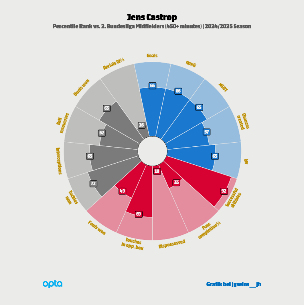 흥미롭게도, 또한 선수에게 유리하게도, 옌스 카스트로프는 이미 이와 매우 비슷한 임무를 심심치 않게 수행했습니다. 지난 시즌, 크리스티안 피엘이 지휘하던 1. FC 뉘른베르크는 공 점유율을 높이고 전체적인 경기를 주도하려 했습니다. 작년 4월, FC 샬케 04와 맞붙은 방문 경기를 예로 들면, 62,728명의 관중이 매진시킨 펠틴스-아레나에서 2 대 0으로 홈 팀이 이겼는데, 90분 동안 공을 더 오래 만진 쪽은 오히려, 방문객이었습니다. 피엘로는 기본적으로 중원에 역삼각형을 그리는 (골키퍼부터) 1433 대형을 썼지만, 공격 조립 시, (다시 골키퍼부터) 13241 형태로 변형을 꾀했습니다. "젝서(Sechser; 고전적인 분류로 6번 자리 미드필더)" 플로리안 플리크를 두 명의 중앙 수비수, 오른발잡이, 핀 옐치(현 VfB 슈투트가르트 소속 수비수)와 왼발잡이, 야네스 호른(현 세인트루이스 시티 SC 소속 수비수) 사이로 내렸고, 좌우 측면 수비를 담당한 오른쪽의 얀 자메라(현 1. FC 카이저슬라우턴 소속 수비수)와 왼쪽의 너새니얼 브라운(현 아인트라흐트 프랑크푸르트 소속 수비수)에게 중앙으로, 사선으로 접어 들어오는 움직임을 요구했습니다. 동시에, 두 명의 "아흐터(Achter; 고전적인 분류로 8번 자리 미드필더)", 오른쪽의 카스트로프와 왼쪽의 잔 우준(현 아인트라흐트 프랑크푸르트 소속 미드필더/공격수)은 절반 공간 내지, 측면 공간에 배치함으로써 완전히 옆줄에 달라붙은 채로 폭을 제공하던 좌우 날개 공격수, 오른쪽의 베냐민 골러, 왼쪽의 루카스 슐라이머와 같이, 상대 측면 수비수에 대한 2 대 1 수적 우위를 점하도록 했습니다. 거의 하나의 몸통으로 따라다닌 상대 수비 대형을 한쪽으로 끌어들이는 데 이러한 규칙이 효과를 봤습니다. 이날은 다만, 좌우 전환 속도가 떨어지면서 득점에 실패했고, 뒤쪽에서 사소한 연결 실수가 발생하고, 자꾸만 (공 소유권을 상실하고) 역압박 시점이 늦어, 피엘로의 팀이 전체적으로 좋은 경기를 하지는 못했습니다. 카스트로프의 개인 경기력은 무난했습니다.