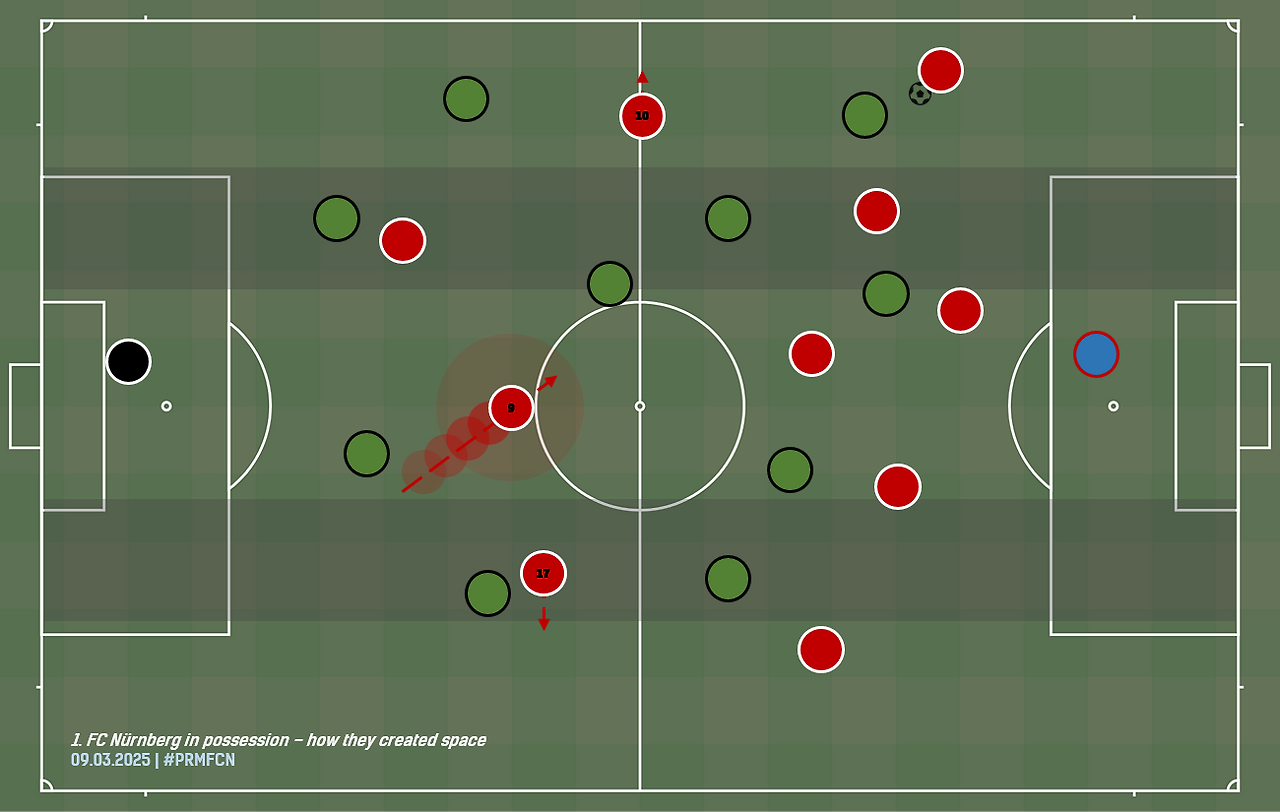 이번 시즌 초반, 미로슬라프 클로제 감독의 1. FC 뉘른베르크는 한편, 유독, 전술적인 시행착오를 많이 겪었습니다. 잊을 만하면, 여러 매체에서 클로제 감독에게 "위기"라는 표현을 들먹이며 부담을 준 끝에, 기본적인 숫자상 대형도 자주 달라졌고, 선수 선발도 간간이 바뀌었습니다. 그나마 최근에는 골키퍼부터 13322 또는 15122 대형에 안착, 이전보다 안정적인 모습을 보여 주고 있으며, '최고의 열한 명' 얼굴도 거의 가려진 모양샙니다. 지난 9일, 뮌스터 원정 경기를 복기하면, SC 프로이센 뮌스터(기본적으로는 골키퍼부터 14231 대형)는 전방에서부터, 골키퍼를 제외하고, 334 형태로 1. FC 뉘른베르크의 공격을 받아냈습니다. 자연스레 경기장 전역에서 대인 방어가 이루어지니, 특히 중앙, 절반 공간에서 클로제 감독이 내세운 두 명의 아흐터 혹은 "체너(Zehner; 전통적인 10번 미드필더)", 율리안 유스트반과 옌스 카스트로프가 자유롭게 공을 받을 틈이 거의 발생하지 않았습니다. 이들에 대한 견제가 그만큼 빡빡했고, 또한 그가 안방에서 자샤 힐트만 감독의 주안점이었습니다. 물론, 클로제 감독이 아무런 저항 없이 이에 말려들지는 않았습니다. 그는 뒤쪽에서 공격을 조립할 때, 유스트반과 카스트로프를 자주, 좌우로 넓게 찢어지게 하여, 그들을 담당하는 상대 수비수들이 옆줄 부근으로 끌려 나가도록 했습니다. 중앙에 발생하는 비교적 너른 공간으로 최전방 두 명의 공격수 중 하나(위 장면에서는 9번의 스테파노스 지마스)를 내리면서, 그가 그곳에서 공을 잡고, 골을 노리도록 할 심산이었습니다. 측면 수비수가 공을 잡으면, 그와 가장 가까운 중앙 수비수(로빈 크노헤를 중심으로 늘어선 세 명 가운데 끝의 한 명; 오른쪽의 팀 드렉슬러와 왼쪽의 니크 자이델)가 순간적으로 "젝서" 카스파 얀데어와 같은 높이로 전진, 공을 받자마자 (방금 공을 넘기고 움직이는 선수의) 주로에 되돌려주는 "벽" 역할을 함으로써 상대 압박에서 탈출했으니, 설사 그 이후에 자니스 앙티스트나 지마스에게 곧장 공이 닿지 못하더라도, 유스트반이나 카스트로프가 바깥쪽으로 이동해 대기하면, 연결의 정확도를 높일 수 있는 장점도 있었습니다. 승부는 후반 17분 무렵에 앙티스트를 대신해 들어간 루카스 슐라이머가 투입된 지 20여 분 만에 뽑은 골로 결정됐습니다. 카스트로프가 공 소유권을 찾아온 뒤, 지마스에게 길게 공을 보냈고, 다시 지마스에게서 공을 넘겨받은 슐라이머가 오른발 슈팅으로 상대 골망을 흔들었습니다.