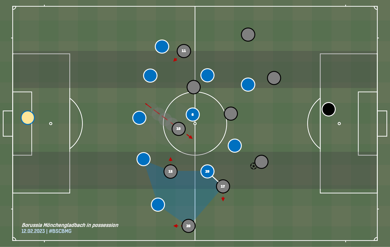 옌스 카스트로프가 기술이 아예 떨어지는 선수는 아니고, 직접 공을 몰아서 상대를 돌파하기도 즐기는 선수라지만, 공을 조금 더 침착하게, 안정적으로 다룰 줄은 알아야 합니다. 사방에서 압박당하는 중앙에서 그는 종종 너무 쉽게 공을 잃어버립니다. 동료를 찾는 연결의 정확도도 다소 떨어지고, 최종 의사결정 단계에도 개선의 여지가 많이 남아 있습니다. 직접 상대 골키퍼를 시험하여 단위를 마무리하거나, 좋은 위치를 선점한 동료에게 연결해 줄 적절한 순간을 놓칩니다. 뉘른베르크에서 사실상 유일하게 양쪽 골대 모두에 존재감을 드러내는 미드필더가 빠른 발을 앞세워서 공간 침투, 득점 기회도 왕왕 잡지만, 슈팅 세 개마다 한 개도 미처 골대 안으로 집어넣지 못하는 점은 아쉽습니다. 아르투로 비달보다 가깝게, 보루시아 묀헨글라트바흐라는 그의 목적지에 따라, 더욱 관련성 높게 카스트로프가 연상시키는 선수 하나는 마누 코네(AS 로마)입니다. 2021년부터 지난해까지 망아지 클럽의 일원으로 분데스리가 경기장을 누빈 코네는 (카스트로프와 잦은 카드 수집과 상대적으로 떨어지는 패스 정확도 등, 일부 약점을 공유하면서도) 저돌적인 공 운반 능력으로 깊은 인상을 남겼습니다. 그는 아디 휘터(현 AS 모나코 FC 감독)가 이끄는 보루시아 묀헨글라트바흐의 핵심 "엔진"이었고, 다니엘 파르케(현 리즈 유나이티드 FC 감독)와 제리 세오아네가 지휘봉을 이어받는 중에도 '건강하면' 거의 자리를 지켰습니다. 단, 휘터는 야생마를 풀어놓듯, 그가 전방위로 활동하며 자유롭게 공을 잡고 팀 공격을 이끌게 했다면, 파르케와 세오아네 체제에서는 대각선을 그리면서 측면으로 공을 보내는 공격 전개, 속공 시도가 부쩍 늘어나, 마르퀴스 튀람(현 FC 인테르나치오날레 밀라노 소속 공격수)이나 요나스 호프만(현 바이어 04 레버쿠젠 소속 공격수), 알라산 플레아, 프랑크 오노라 등, 측면에서 일차적인 공의 출구 역할을 하는 공격수에게 대부분 조명을 빼앗겼습니다. 그래도 코네가 공을 잡으면, 여전히 그는 상대 팀에 틀림없이 위협적인 존재였으므로, 파르케와 세오아네 감독은 그에게 새로운 옷을 입혀, 그가 계속, 전술적으로 중요한 몫을 하도록 했습니다. 두 감독 모두, 뒤쪽에서 팀 공격을 조립하는 역학을 다양화하는 일에 공을 들였으니, 주로 좌측면 수비수, 2022-23년의 라미 벤제바이니(현 보루시아 도르트문트 소속 수비수)와 이후, 루카 네츠, 루카스 울리히가 높이 올라설 때, 반대편의 조 스컬리, 슈테판 라이너를 비교적 낮은 위치에 남겨, 아래쪽에 비대칭적인 삼인조를 꾸리거나, 한 명의 수비형 미드필더(주로 율리안 바이글)를 두 명의 중앙 수비수와 같은 높이로 내리고, 골키퍼를 올리면서 같은 효과를 기대했습니다(물론, 아예 처음부터 세 명의 중앙 수비수를 배치하기도 했습니다.). 또는 골키퍼부터 1244 형태를 만들기도 했는데, 이 경우, 경기장을 세로선으로 반, 그리고 위아래로 다시 반을 나누어, 중앙선 위, 한쪽 측면에서 상대와 (최소; 대개) 4 대 4의 숫자 싸움을 걸 수 있었습니다. 코네는 의도적으로 왼쪽 절반 공간에 자주 빠졌습니다. 그를 자유롭게 둘 수 없는 상대 미드필더가 옆줄에 끌려 나와, 중앙에서 다른 선수(예를 들어, 공격형 미드필더나 측면에서 좁힌 날개 선수)가 활용할 틈을 벌리도록 하기 위함이었습니다. 말하자면, 가운데 공간을 넓히기 위한 최상의 "미끼"가 된 셈입니다.