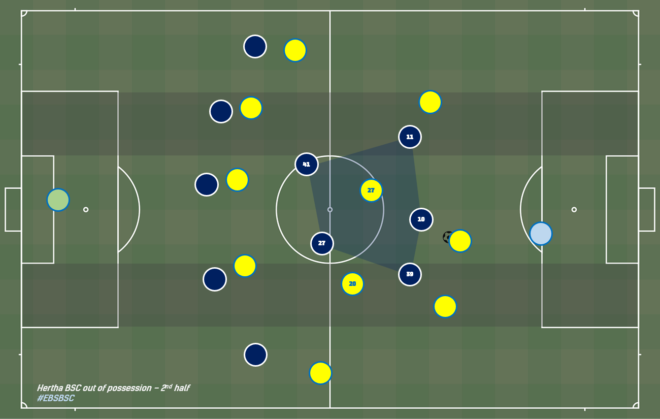 사실, 공 소유권을 잃고 앞쪽에 오각형을 그리기는 헤르타 BSC도 마찬가지였습니다. 이브라힘 마자가 파비안 레제와 데리 셰어한트 사이로 올라서면서 전방부터 (골키퍼를 제외하고) 325 형태를 만들곤 했습니다. 압박한다고 상대 공 잡은 중앙 수비수에게 적극적으로, 팀 단위로 달려들지는 않았습니다. 문제라면, 전방 삼인조와 그 아래 둘, 미카엘 퀴장스, 파스칼 클레멘스의 간격이 그리 촘촘하지 못했습니다. 아인트라흐트 브라운슈바이크는 그 기본 대형(골키퍼부터 숫자로 1343 형태)에 따라, 방문객이 그린 오각형 안에 두 명의 선수를 두었습니다. 전반전에는 '그런데도' 전방 세 명의 선수를 보고 길게 공을 보내는 시도가 많았고, 그 효과가 미미했습니다. 후반전 시작과 함께, 다니엘 셰어닝 감독은 율리안 바스를 불러들이고 리치먼드 태치를 투입, 서보 레벤테 대신, 제바스티안 폴터를 넣으며, 라얀 필리프와 폴터, 태치로 공격진을 재편하고, 리노 템펠만을 스벤 쾰러의 왼편으로 내렸습니다. 이후, 니더작센의 사자 군단은 쾰러와 템펠만을 자주 활용하며 기회를 만들고 공격 강도를 높였습니다. 나중에는 아예 쾰러나 템펠만 중 하나만 '오각형' 안에 남기며 골키퍼부터 131 대형으로 견제를 이겨나갔습니다. 기본적으로 헤르타 BSC가 압박 강도를 키우지 않았고, 셰어한트와 마자, 레제의 (수비 시) 발걸음이 모두 무거워진 뒤로는 이들이 구축하는 최전선만 넘어도, 홈 팀 선수가 가운데서 앞을 보고 공을 차서 공격을 전개하기가 그다지 어렵지 않았던 까닭입니다. 특히 템펠만이 공을 잡고 오른쪽으로 길게, 앞으로 뿌려서 측면을 공략하는 모습을 왕왕 보였습니다. 마자가 빠르게 내려오지 않으면, 헤르타 BSC는 (전방서부터 골키퍼를 제외하고) 325 형태로 상대 공격을 받아내야 했는데, 퀴장스와 클레멘스의 부담이 아무래도 컸습니다. 상대 두 명의 처진 공격수가 원정팀 최후방 세 명의 중앙 수비수와 측면 수비수 사이, 혹은 (가운데) 토니 라이스트너와 리누스 게히터, 다르더이 마르톤 사이를 호시탐탐 노리면서 만회하는 골을 넣기 위한 시도를 계속했습니다. 전반전에는 헤르타 BSC가 공 점유율 면에서 근소한 우위를 점했다면, 후반전에는 아인트라흐트 브라운슈바이크가 공을 소유하는 시간이 훨씬 길었습니다. 슈테판 라이틀 감독은 결국, 후반 20분, 디에고 데메가 퀴장스와 교대하도록 하면서 허리의 수비적인 역량을 강화했습니다.