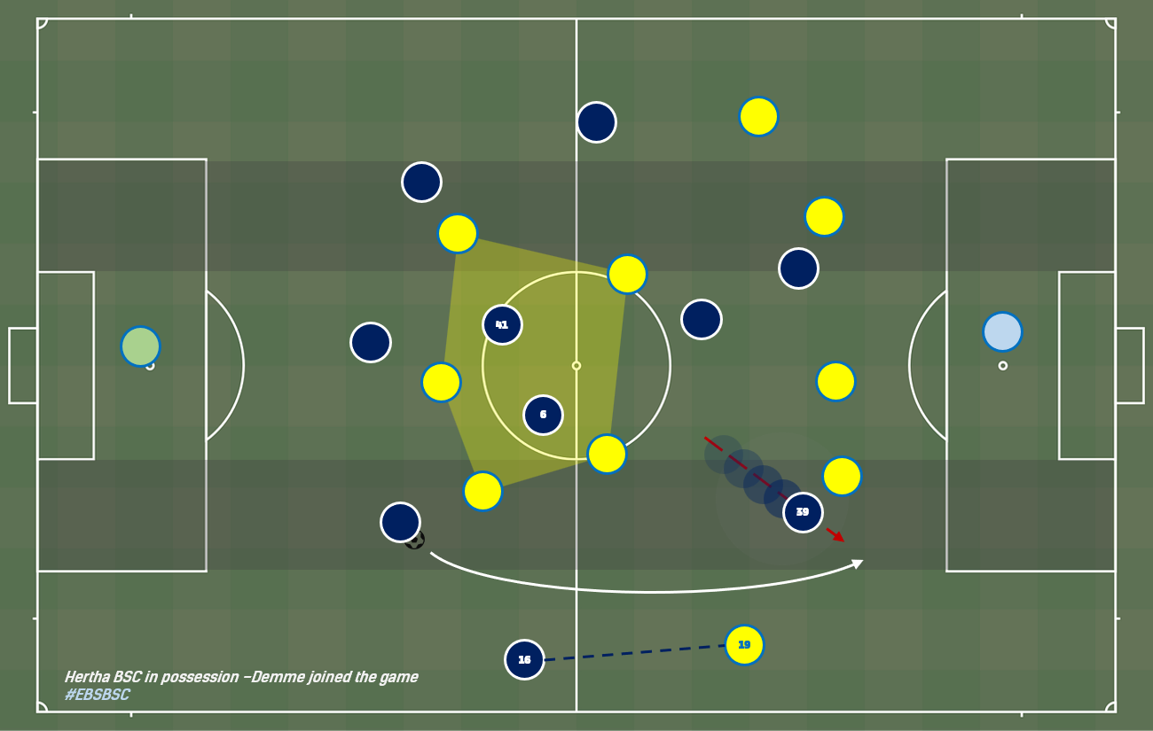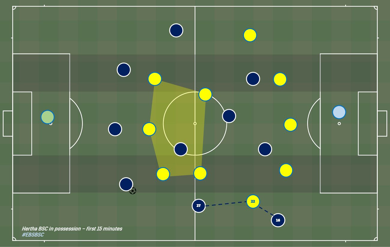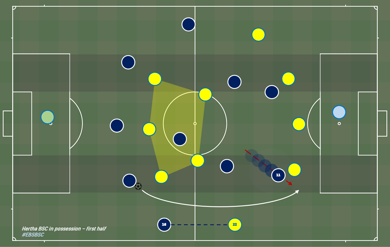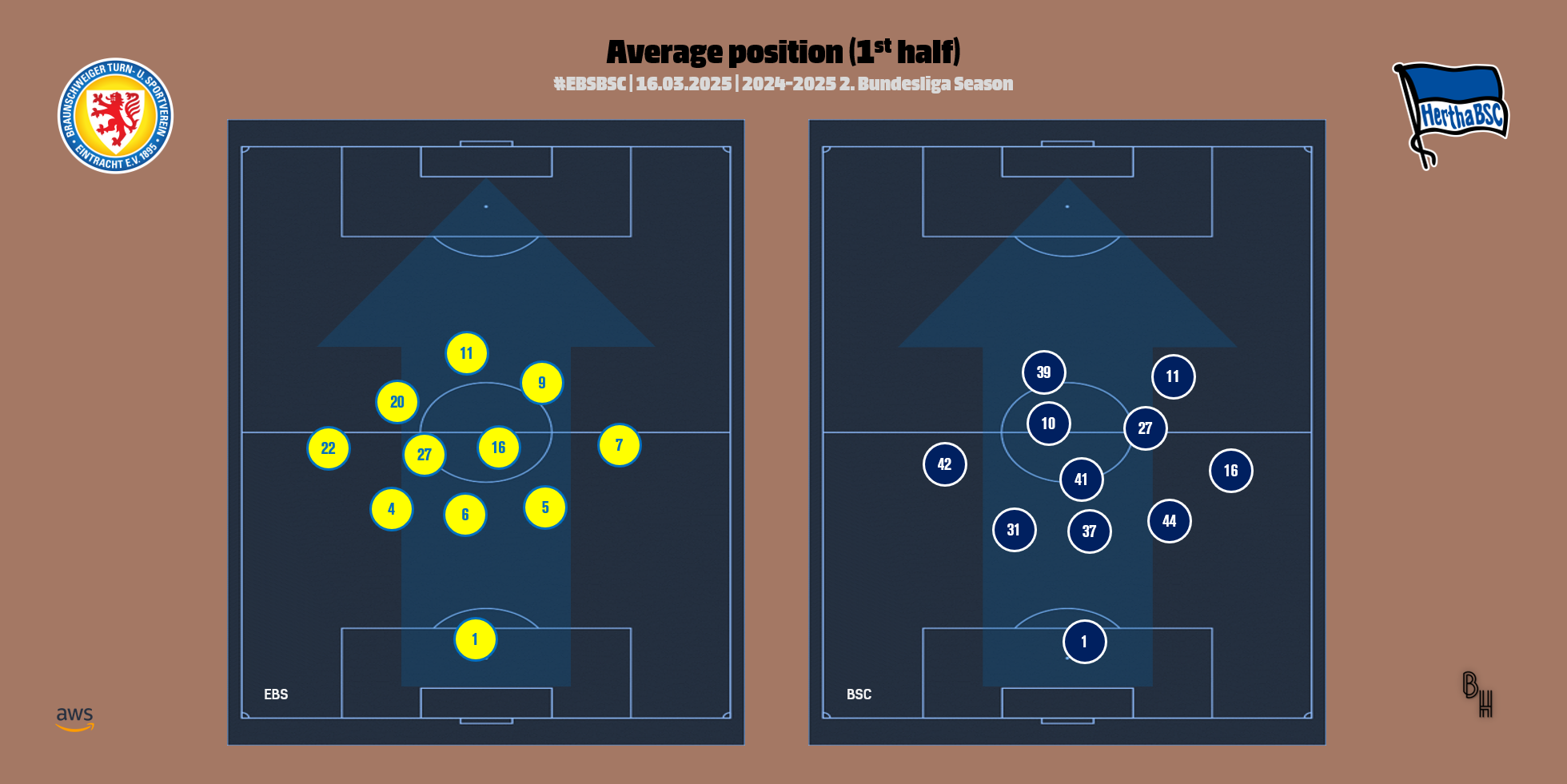 헤르타 BSC는 아인트라흐트 브라운슈바이크와 전반기 대결, 안방에서 3 대 1로 이겼지만, 전체적으로 고전했습니다. 그 경기에는 (아직 리노 템펠만이 이적하기 전이므로) 조한 고메스가 서보 레벤테, 라얀 필리프와 공격을 이끌었으며, 수비 시에는 이 삼인조가 거의 공동 임무를 수행했습니다. 이들은 서로 간의 높이차를 거의 두지 않은 채, 슈프레아테너의 일차 보급관들을 기다렸고, 뒤에서 대기한 두 명의 젝서와 함께 오각형을 그려, 베를린의 노파가 경기장 가운데 통로로 쉬이 공을 보내지 못하게 했습니다. 크리스티안 피엘이 지휘한 헤르타 BSC는 구태여 이 오각형 안으로 공을 집어넣으려고 전전긍긍하면서도 그곳에 공이 투입돼도 골을 향해 돌아서지 못하고 뒤로 돌리기를 반복하여 전진에 어려움을 겪었습니다. 다니엘 셰어닝 감독은 시즌 두 번째 맞상대에도 같은 일이 일어나리라고 확신에 찬 듯합니다. 경기 시작을 알리는 플로리안 바트슈튀프너 주심의 호각 소리가 울리고 헤르타 BSC가 뒤쪽에서 공을 점유하자, 사자 군단은 전방부터 (골키퍼를 제외하고) 325 형태로 늘어서며, 가운데 오각형 그리기에 집중했습니다. 이날은 파스칼 클레멘스가 주된 표적이었습니다. 하지만, 셰어닝 감독의 이러한 시도는 금세, 다섯 달 전보다 효과가 없다고 드러났습니다. 슈테판 라이틀 감독은 피엘 전 감독과 달리, 뒤쪽에서 짧은 연결로 확률을 높여 가며 공 소유권을 유지/연장하는 데 별다른 관심을 보이지 않았습니다. 초반 십오 분 동안, 미카엘 퀴장스가 이브라힘 마자와 같은 높이에 대기하지 않고, 오른쪽 측면으로 빠지면서 공을 받는 모습을 자주 보였습니다. 이는 높이 전진한 존조 케니와 함께, 상대 왼쪽 윙백, 파비오 디미켈레 산체스에 대한 2 대 1 수적 우위를 만들며, 그에게 (누구를 막을지) 선택을 강요했습니다. 자연스레, 아인트라흐트 브라운슈바이크의 '오각형', 왼쪽 꼭짓점을 맡은 선수들이 한두 발씩 측면으로 끌려 나오며, 가운데서 클레멘스가 공을 잡을 환경이 조성됐습니다. 클레멘스가 곧장 퀴장스나 마자를 찾을 수만 있으면, 이는 중앙선 위에서 순간적으로 5 대 5(또는 6 대 6)의 상황을 만들었습니다. 결국, 클레멘스를 거쳐, 마자가 빠르게 반대로 전환해 준 공이 퀴장스를 타고 케니에게 전달돼, 그의 짧은 중앙 연결과 파비안 레제의 슈팅으로 마무리, 이른 시간, 선제골을 낳았습니다. 디미켈레 산체스가 안쪽으로 좁힌 터라, 케니는 완전히 자유로운 상태에서 레제에게 공을 보낼 수 있었습니다.