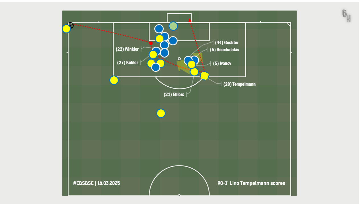 헤르타 BSC는 많은 숫자를 가까운 골대 쪽에 배치했습니다. 리노 템펠만이 대기하던 먼 쪽에는 안드레아스 부할라키스와 리누스 게히터, 둘만 있었고, 처음에 둘은 로베르트 이바노프, 한 명과 팔로 싸움하며 맞섰습니다. 라얀 필리프가 공을 차던 시점, 이바노프는 골문을 향해, 자신의 오른쪽으로 달렸고, 게히터가 그를 쫓았습니다. 순간적으로 이들과 겹쳤던 부할라키스는 안쪽(티아크 에언스트 골키퍼 시점에서 오른쪽)으로 돌아서 빠져나와, 그 방향으로, 대각선으로 침투하던 케빈 에러스를 잡으려고 했습니다. 이내 공이 그들 머리 위를 지나치자, 부할라키스가 재빨리 템펠만을 발견하고 몸을 날렸지만, 상황을 수습하기에는 이미 늦었습니다. 게히터나 부할라키스를 탓할 수만은 없는, 불운한 실점이었음이 분명합니다. 앞쪽에서 굴절되고 공이 떨어지는 순간, 그 공은 누구의 공도 아니게 되는 법입니다. 템펠만이 처음부터 제일 좋은 위치를 점했습니다. 페널티 구역 안을 전부 방어할 수 없으니, 한쪽을 선택하여 집중해야 함도 사실입니다. 다만, 순간적으로 게히터와 부할라키스가 교차하여 움직이고, 부할라키스가 자신의 다음 상대를 찾기까지 불안하게 움직여야 했던 점은 걸립니다. 수비수의 확신 없는 동선이 길어질수록, 맞춤전술에서 실점 확률은 올라가기 마련입니다. 이 실점 장면을 충분히 분석, 공부하여 다음에는 같은 일이 발생하지 않도록, 구조적인 최적화에 나서야 합니다. 한쪽의 숫자를 상대적으로 덜어내기로 했다면, 그곳에서는 더욱이, 사소한 실수라도 발생하지 않도록 해야 합니다.