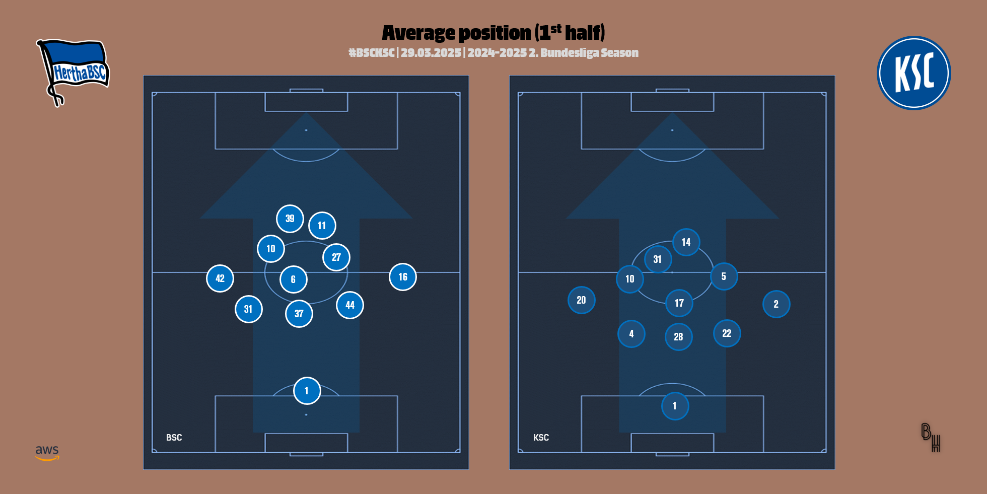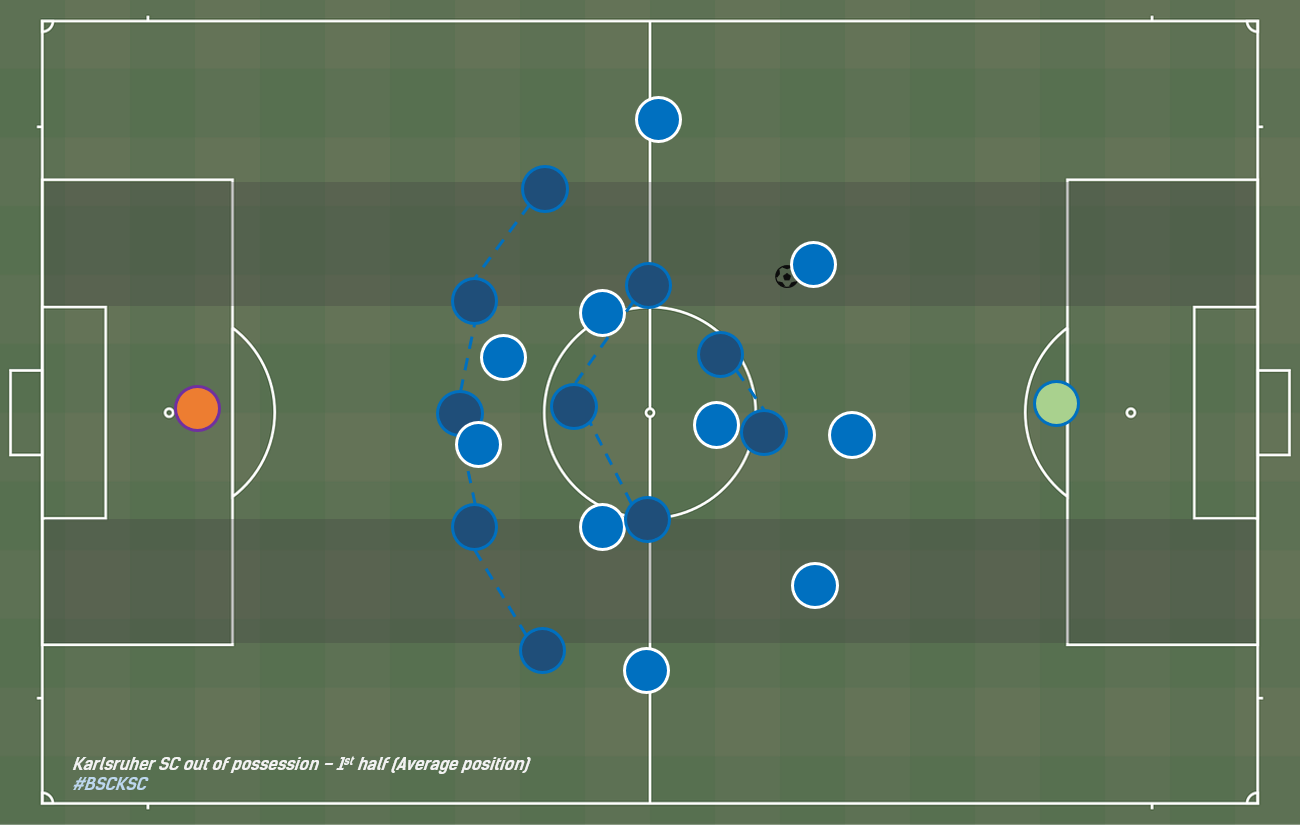 후반기, 끝 모를 부진에 빠진 칼스루어 SC는 올림피아슈타디온 베를린에서 수비 시, 앞에서부터 (골키퍼를 제외하고) 비교적 정직한 235 형태를 갖추려고 노력했습니다. 전방에서 강한 압박은 거의 하지 않았고, 헤르타 BSC 중앙의 선수들이 티아크 에언스트 골키퍼에게 공을 내려주며 뒤로 물러설 때만 간간이 눌러주는 수준에 머물렀습니다. 맨 앞에서 이를 이끈 미글 카우프만과 밤바세 콘테는 리누스 게히터, 토니 라이스트너, 다르더이 마르톤과 제법 거리를 두고, 측면으로 공을 밀어내는 데 열중했습니다. 결국, 베를린의 노파가 옆줄 부근으로 공을 옮기면, 이곳에서 여러 상황이 발생했습니다. 칼스루어 SC 좌우 윙백이 공 받는, 마주 보는 자리의 선수에게 도전할 수 있었고, 급할 때는 심지어, 마르셀 바이푸스나 크리스토프 코발트가 올라와서 힘으로 견제할 수도 있었습니다. 하지만, 대개 그렇게 하지 않았고, 카우프만과 콘테가 빠르게 측면 방어를 지원함과 동시에, 가운데 세 명의 허리에서 공과 제일 가까운 선수가 호를 그리듯이 슈프레아테너 윙백에게 접근하여, 전개를 방해했습니다. 중원에 여유 숫자가 하나 있었으니(3 대 2 싸움), 이상적으로는 니콜라이 라프와 나머지 한 명의 미드필더(공이 방문객의 왼편에서 돌 때는 로빈 호이서, 그 반대 경우에는 마빈 바니체크)가 미카엘 퀴장스, 이브라힘 마자를 묶으면서 수비 효율성을 높일 수 있었습니다. 크리스티안 아이히너 감독이 수비 시, 가급적 윙백의 전진을 막은 까닭은 이 주 전, 브라운슈바이크에서 헤르타 BSC가 거둔 5 대 1 대승 비결이 상대 윙백이 높이 올라설 때, 그 등 뒤로 발생하는 공간 타격이었음을 알았기 때문입니다. 슈테판 라이틀 감독은 니더작센의 사자 군단 좌우 윙백, 특히 왼쪽 윙백, 파비오 디미켈레 산체스, 교체 이후 레온 벨 벨을 끌어낸 뒤, 목표하는 공간에 치명적인 무기, 파비안 레제와 데리 셰어한트를 풀어놓고 수직적으로 그곳에 공을 떨어뜨림으로써 단순하지만, 확실한 득점 규칙을 만들었습니다. 아이히너 감독은 이날, 베를린 베스트엔트에서 그와 같은 일이 반복되기를 원치 않았습니다.