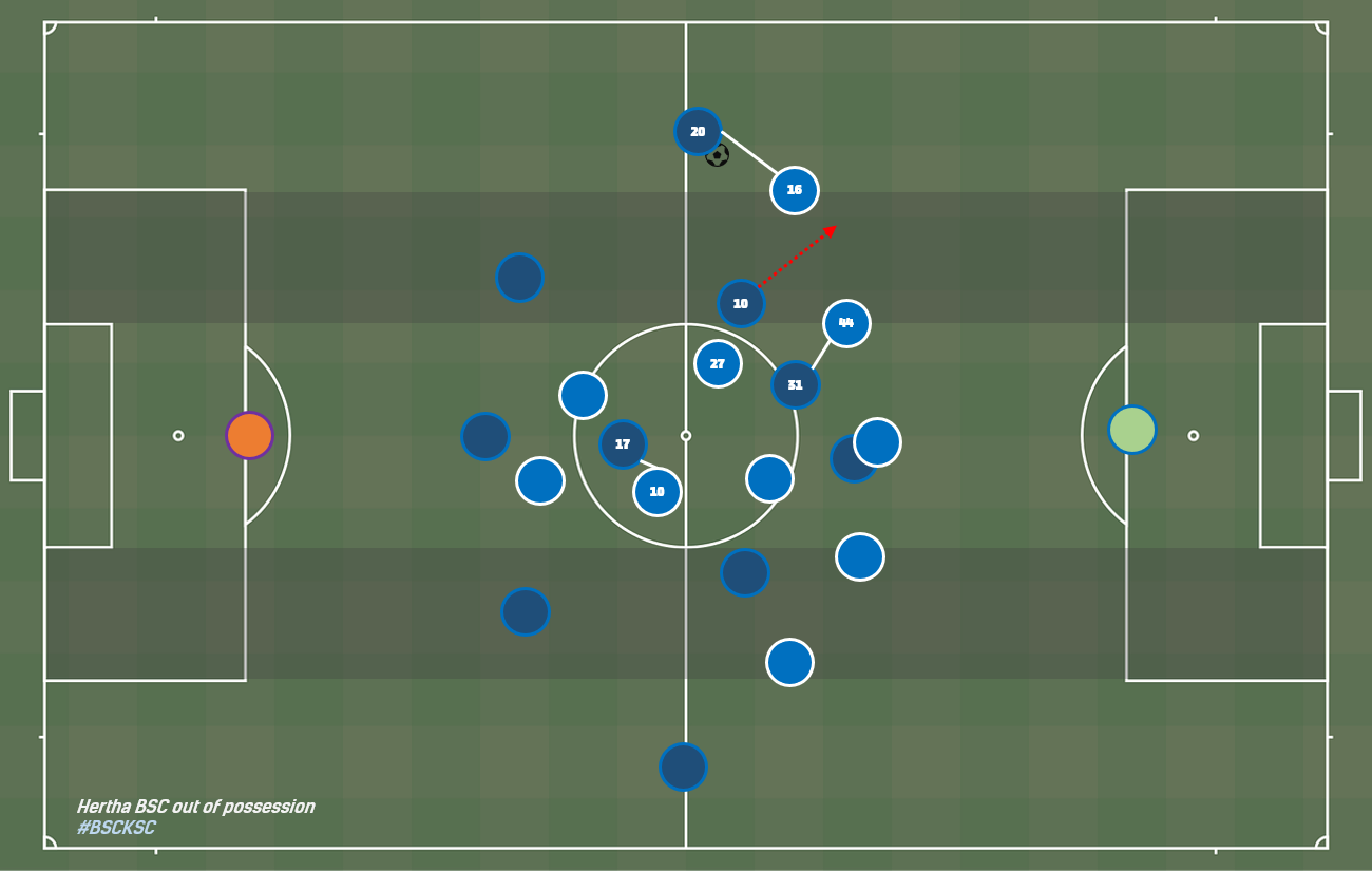 수비 시, 헤르타 BSC는 전방에서부터 (골키퍼를 제외하고) 325 또는 2125 형태를 띠었습니다. 브라운슈바이크에서와 마찬가지로, 이브라힘 마자가 파비안 레제와 데리 셰어한트 사이로 올라서면서 전방에 숫자를 더했는데, 이날은 마자가 상대 젝서로 출전한 니콜라이 라프(후반 11분경에 제니스 부르니치가 그와 교대했습니다.)를 주로 따라다니면서, 이 주 전, (수비 1선과 2선 사이 공간에서) 스벤 쾰러와 리노 템펠만을 자유롭게 해 주었던 실수를 되풀이하지 않으려고 했습니다. 마자가 빠지고 케빈 제사가 들어간 뒤에는 미카엘 퀴장스가 한동안 마자의 역할을 이어받았고, 후반 42분경, 슈테판 라이틀이 허리의 높이와 체력을 보강하려고 퀴장스를 빼고 안드레아스 부할라키스를 투입(사실, 부할라키스의 연봉을 생각하면, 이 정도 역할을 위해 그를 쓰는 자체가 지나친, 과한 투자이기는 합니다.)한 뒤에는 제사가 올라섰습니다. 칼스루어 SC에서는 여러 장의 교체 이후, 레온 옌젠(후반 11분경에 로빈 호이서와 교대했습니다.)이 중앙 수비수에게서 직접 공을 넘겨받을 수 있는 위치로 내려와, 부르니치에게 집중된 견제를 분산해 주기도 했습니다.