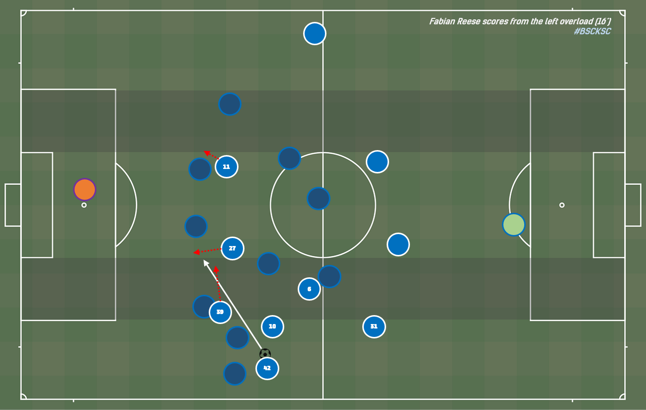 절반 공간에서 중앙으로 공을 연결하기가 여의치 않으면, 측면에서 두 명의 선수가 빠르게, 대각으로 공을 주고받으며 기회를 엿보았습니다. 이러한 시도는 오른쪽에서 두드러지게 나타났는데, 존조 케니와 미카엘 퀴장스, 파비안 레제 등이 고루 관여하여, 깊숙이 공을 전진시키고 가운데로 연결을 도모했습니다. 루카 슐러의 쐐기 골도 결국, 케빈 제사(후반 32분 무렵에 이보 마자를 대신했습니다.)와 마텐 빙클러(후반 27분경에 리누스 게히터를 대신했습니다.)의 호흡으로 왼쪽 측면을 허물면서 감겨올라온 공에서 나왔습니다.