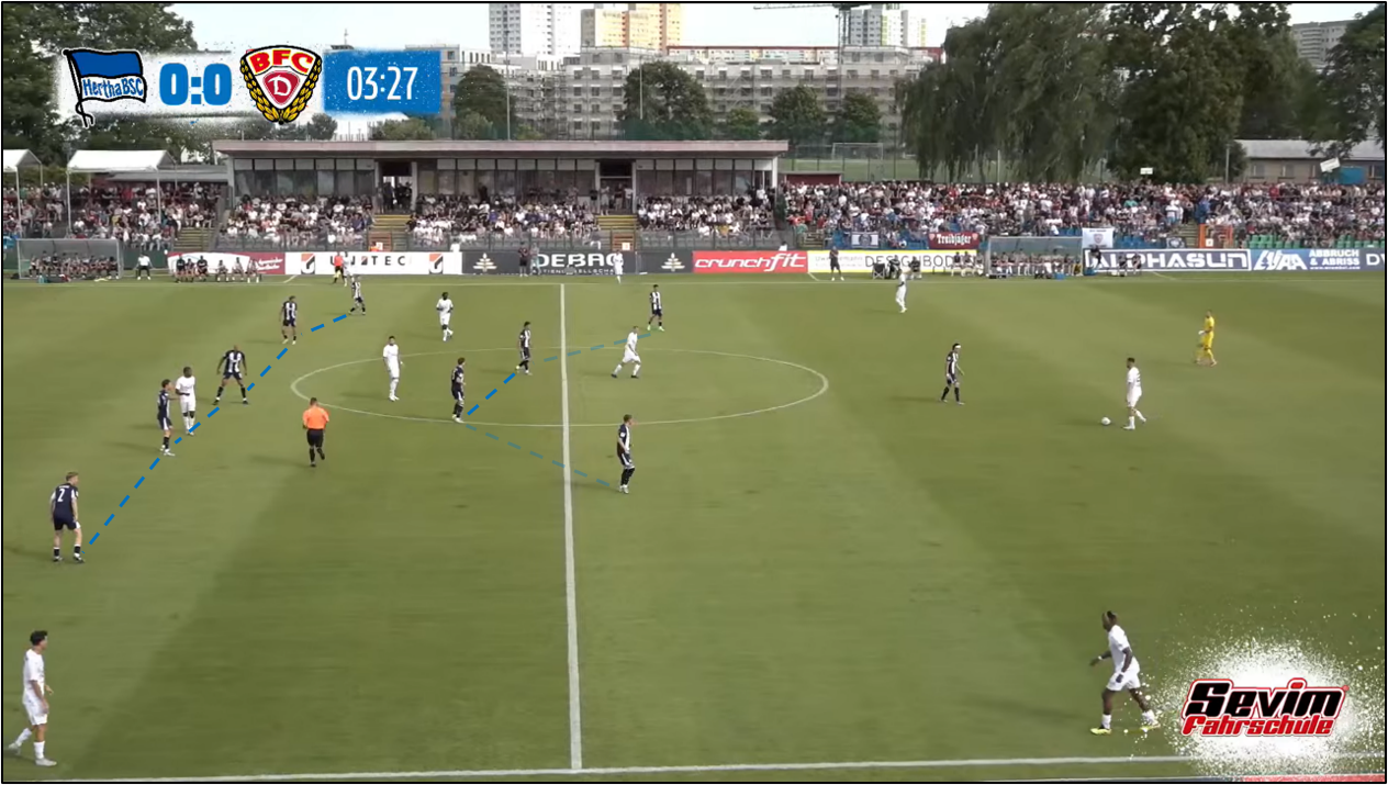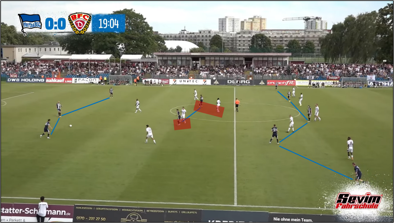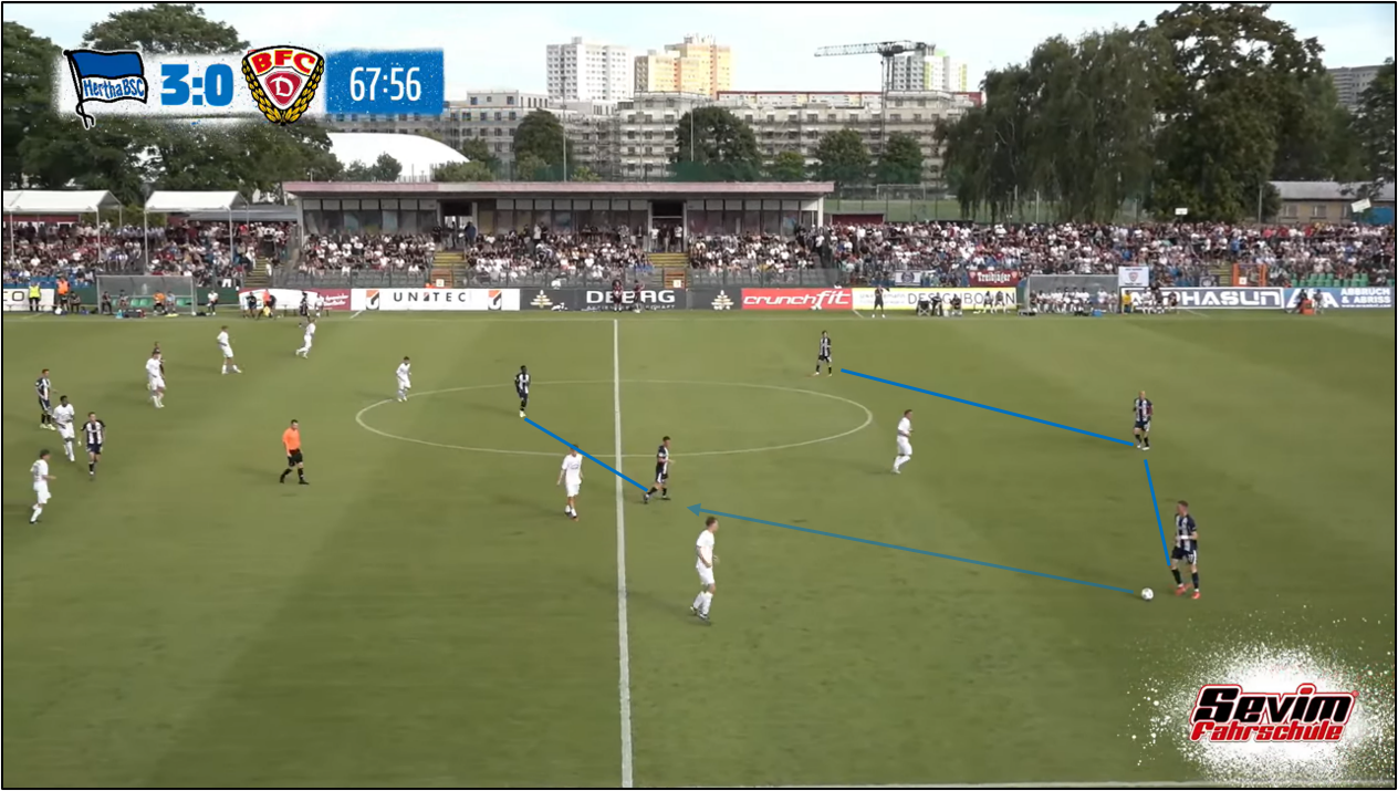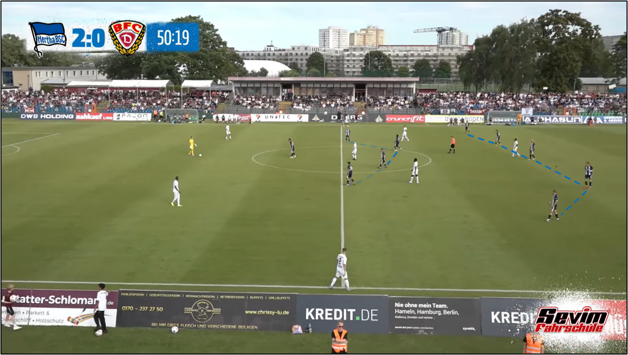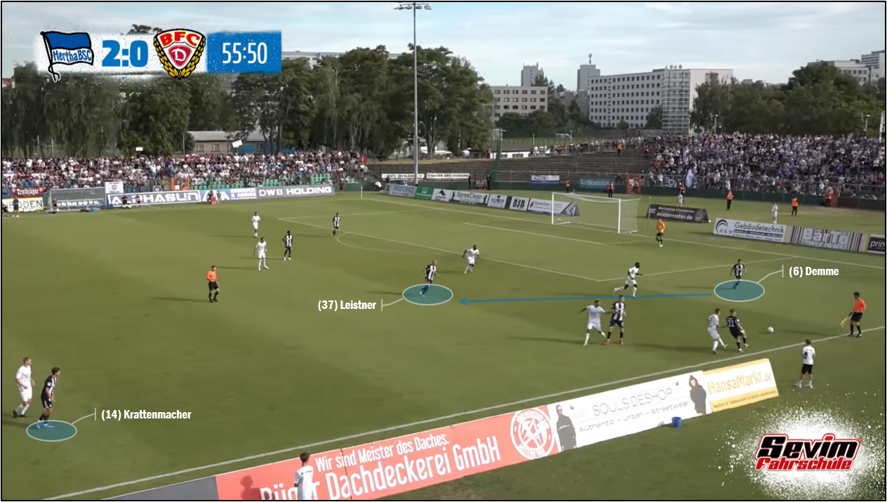 옆에서 보리스 마무자 룸이 기꺼이 짐을 나누어서 지며, 디에고 데메가 마음 놓고 공간을 찾아 돌아다닐 환경이 조성되기도 했습니다. 데메와 보보, 특히 데메가 순간적으로 세 명의 중앙 수비수 중 가운데 선수(토니 라이스트너, 마지막 십 분 동안은 리누스 게히터)와 자리를 바꾸어서 공을 잡는 장면도 후반전에 종종 나왔습니다. 이는 대인 방어 원칙에 기초하여 전방에서 팀 단위 압박을 수행한 BFC 뒤나모 선수들을 한층 더 혼란스럽게 하여, 헤르타 BSC가 한두 번 공을 주고받은 만에 위협적인 기회를 만드는 결과로 이어지기도 했습니다. 모리스 크라텐마허의 '비공식' 데뷔골도 이와 같은 장면에서부터 출발했습니다. 후반 10분을 지난 시점, 상대가 베를린 노파의 왼쪽, 깊숙한 지역에서 강하게 압박했는데, 데메가 최종 수비수 세 명보다도 아래로 내려가서 마텐 빙클러에게 공을 넘겨받고는 토니 라이스트너를 찾았습니다. 자유롭게 공을 잡은 라이스트너가 잠시 그를 몰고 올라오다가 공간을 향해 달리는 크라텐마허에게 길게 (공을) 보냈고, 크라텐마허는 그를 자기 소유로 만든 뒤, 상대 중앙 수비수, 아미로 아마두를 앞에 두고 좌우로 흔들다가 마지막에 왼쪽으로 방향을 잡고 슈팅, 니콜라스 오어테겔 골키퍼(올여름에 1. FC 뉘른베르크에 적을 둔 채, 일 년 임대 계약으로 BFC 뒤나모 유니폼을 입었습니다.)의 방어막을 뚫었습니다.