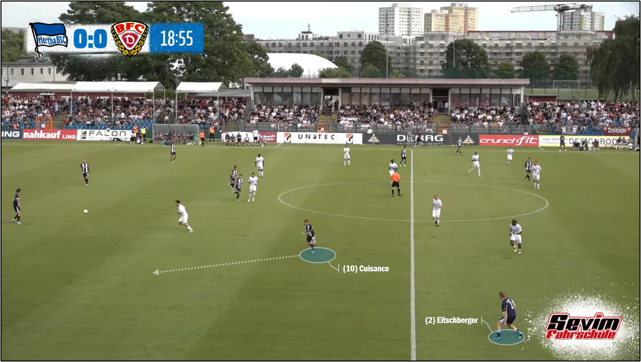 전반전 경기력은 사실, 썩 좋지 않았습니다. 헤르타 BSC 좌우 윙백이 높이 올라가, 옆줄에 붙은 너른 공간, 상대 최종 방어선 끝에서 줄타기를 노리면, 미카엘 퀴장스와 디온 아이바지, 두 명의 체너가 절반 공간을 확보할 수 있었습니다. '이상적으로' 이들은 기초적인 공격 조립 단계에 윙백과 간결하게 공을 주고받거나, 젝서로부터 공을 받아, 날카롭게 대각선으로 공을 찔러, 위협적인 장면을 만드는 임무를 부여받았습니다. 하지만, 전반전 내내, 특히, 퀴장스가 오른쪽 절반 공간, 깊숙이 내려서면서 중앙 수비수로부터 공을 이어받고 앞을 돌아보는 빈도가 훨씬 잦았습니다(왼쪽에서 아이바지가 내려오기도 했으나, 애초에 오른쪽에서처럼 기회가 많지는 않았습니다.). 이는 BFC 뒤나모의 앞쪽 수비선, 중앙 경계를 좌우로 느슨하게 하는 데 도움을 주어, 헤르타 BSC가 다시 가운데, 젝서에게로 비교적 쉽게 공을 투입하는 효과를 냈습니다. 후방에서 레온 옌젠과 미하우 카르보프니크에게 연결이 쉽지 않은 상황에서 퀴장스가 중간 다리를 놓아 주고 올라가는 공격 전개를 볼 수 있었습니다. 하지만, 퀴장스 또는 아이바지가 중앙선 아래로 멀리 내려오면 내려올수록, 그만큼 중앙선 위, 골대와 가까운 곳에 대기하는 숫자는 줄어들 수밖에 없었습니다. 파비안 레제가 정통적인 중앙 공격수가 아니라는 점을 이 대목에 기억해야 합니다. 그가 측면으로 나가서 공을 잡았을 때도 누군가는 중앙에서 골을 노려야 합니다. 가장 쉽게, 체너가 빠르게 페널티 구역 안으로 들어갈 수 있어야 합니다. 지난 시즌, "사령탑 교체" 이전, 크리스티안 피엘 전 감독이 팀을 이끌던 때도 '체너' 퀴장스의 왕성한 수직 운동은 이와 같이 양면적이었습니다. '어쨌든' 중앙, 옌젠이나 카르보프니크에게 닿고, 그로부터 공격의 이후 과정을 원활하게 풀 수 있었다면, 그래도 나았을 텐데, 주로, 전진하여 열린 공간을 점유한 율리안 아이치베르거나 마텐 빙클러에게 공을 넘기는 '전환'이 잘 안 되면서 심지어는 일정 시간, 레기오날리가에 속한 팀에 밀리는 듯한 양상을 보이기도 했습니다.