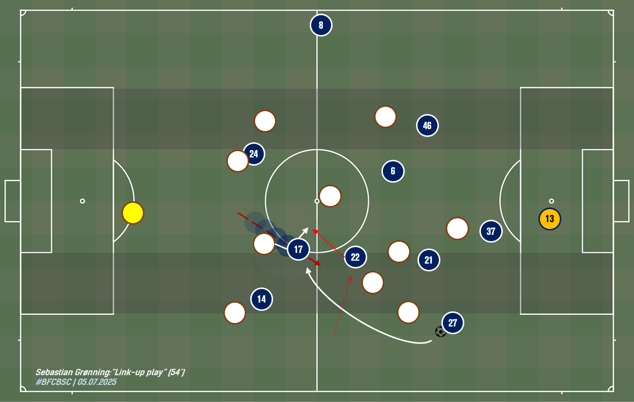 후반전에는 (정통적인 중앙 공격수에 더 가까운) 세바스티안 그뢰닝이 잔디를 밟으면서, 파비안 레제가 공격 선봉에 섰을 때와는 또 다른 전개가 가능했습니다. 그뢰닝이 수비수 하나를 달고 순간적으로 내려오면서 공을 받고, 요운 다구르 소르스테인손이나 모리스 크라텐마허, 또는 측면에서 절반 공간으로 들어오는 마텐 빙클러 등, 윙백에게 돌려주어, 상대 최종 방어선에 균열을 내곤 했습니다. 후반 28분 무렵에 터진 소르스테인손의 팀 네 번째 득점이 이렇게 나왔으니, 그뢰닝이 니클라스 콜베가 넘겨 준 공을 모리츠 폴테를 등진 채 크라텐마허에게 연결했습니다. 크라텐마허는 곧장, 폴테가 비우고 나온 공간을 주파, 페널티 구역 안까지 직접 공을 몰았고, 골키퍼 앞에서 자기 오른쪽, 맹렬히 달려온 아이슬란드 국가대표 선수에게 슬쩍 (공을) 밀어주어 임무를 완수했습니다. (공식전이 아니라도) 데뷔골은 다음 기회로 미루어야 했지만, 이렇게 직선적이면서도 효율적인 공격 규칙의 축이 될 수 있음을 보여 주었으니, 그뢰닝으로서도 수확이 있는 하루였다고 하겠습니다.