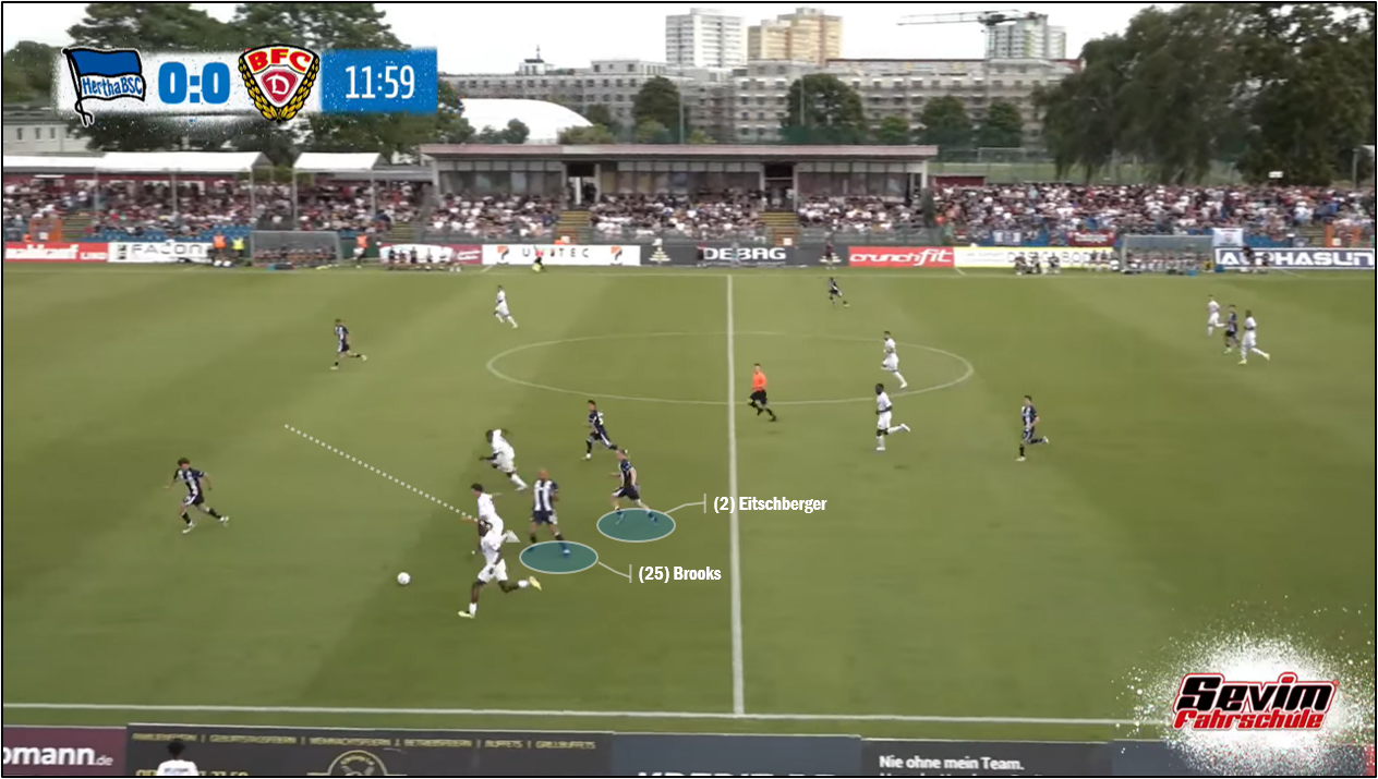 BFC 뒤나모가 전반전 양상을 예상보다 팽팽하게 끌고 갔습니다. (특히 뒤쪽에서 공격을 조립하는 단계에) 데니스 쿠트리프 감독이 전술적으로 공을 들인 부분도 있지만, 상대적으로 체급이 큰 방문객의 실수가 적지 않았던 탓입니다. 압박에 나선 뒤, 윙백이 앞으로 돌격하면서 자리를 비웠는데, 상대가 그를 풀어 나오면, 헤르타 BSC 세 명의 중앙 수비수 중 하나가 달려 나와서 싸워야 했습니다. 공을 빼앗을 수 있으면, 가장 좋았고, 그에 실패하더라도 잠재적인 위협이 덜한 곳에서 반칙으로 흐름을 끊거나, 힘으로 붙어서 공격의 속도를 줄이고, 동료들이 복귀할 시간을 벌어야 했습니다. 처음에는 존 앤서니 브룩스가 기꺼이 이 역할을 했는데(브룩스는 원래도 도전하는 수비를 즐기는 선수입니다.), 여전한 공중에서 장악력이 엿보이는 순간도 있었지만, 반대로, 불완전한 감각을 노출하는 순간도 있었습니다. 반대쪽에서 마텐 빙클러가 최고의 하루를 보냈다면, 오른쪽에서는 율리안 아이치베르거가 고전하기도 했습니다. 이날, 아이치의 돌파가 시원시원하게 이루어지지 않았고, 초반에 수비 국면에서 어려움을 겪으며 절반 공간, 페널티 구역 밖에서 위협적인 슈팅을 얻어맞기도 했습니다. 전반 33-34분 무렵에는 찬 카라타스가 페널티 구역 안에서 공을 방출한 뒤, 아이치가 뒤늦게 미끄러지면서 그에게 도전했습니다. 주심이 관심을 보이지 않았지만, 영상 판독의 힘을 빌릴 수 있는 정식 경기였다면, 골치 아픈 상황이 펼쳐지고도 남았을지 모릅니다.