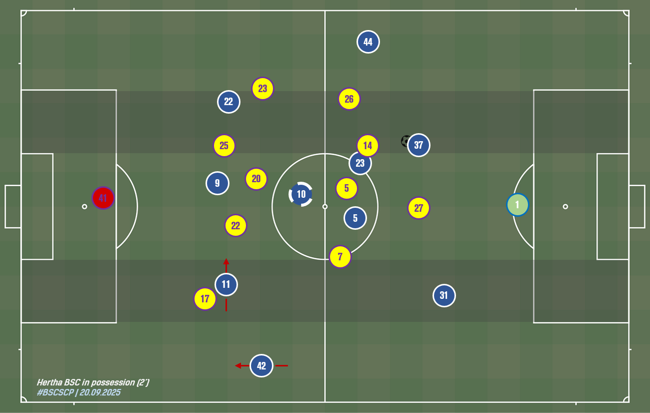 하노버 96와 시합에 공 점유율은 다소 포기하더라도, 빠른 공의 회전, 전진과 측면 공략으로 승리를 일군 헤르타 BSC가 이날은 뒤쪽에서부터 공을 소유하고 차근차근 공격을 만들어가는 장면이 제법 됐습니다(두 팀의 공 점유율은 엇비슷한 수준으로 나타났습니다.). SC 파더보른 07은 앞에서부터 (골키퍼를 제외하고) 145 또는 1225 형태로 수비에 나섰는데, 오른쪽의 필리프 빌비야, 왼쪽의 제바스티안 클라스가 절반 공간으로 좁혀서 공이 측면으로 나갈 때, 가볍게 호를 그리고 그를 따랐습니다. 미카 바우르와 산티아고 카스타녜다는 케네트 아이히호른, 레온 옌젠을 붙잡는 데 집중했으니, 베를린의 노파가 이들 뒤쪽으로 공을 보내, 공간을 점유한 미카엘 퀴장스를 찾으면, 퀴장스가 돌아서면서 그의 창의력을 뽐낼 수 있었습니다.