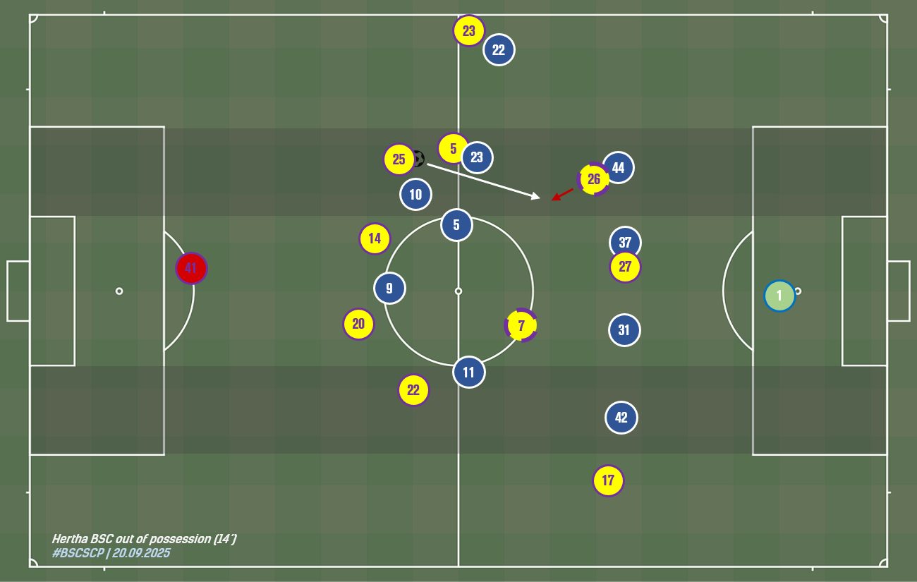 오히려 기회는 상대가 뒤쪽에서 범한 연결 실수를 틈타, 속공으로 나설 때 더 자주 잡았습니다. 헤르타 BSC는 이 경기, 앞에서부터 (골키퍼를 제외하고) 비교적 정직한 1324 형태로 방어했습니다. SC 파더보른 07은 오른쪽 윙백인 라우린 쿠어다를 반대편, 라파엘 오버마이어보다 왕왕 높이 올리고, 마테스 한젠이 오른쪽, 너른 공간으로 빠져서 공격 조립에 도움을 주는 장면을 연출했습니다. 미카엘 퀴장스 좌우로 부지런히 뛰어다닌 미카 바우르와 산티아고 카스타녜다, 두 명의 젝서가 포진했으니, 방문객이 가운데 통로로 공을 보내기가 아주 어렵지만은 않았습니다. 케네트 아이히호른이나 레온 옌젠이 순간적으로 이를 잡겠다고 달려들면, 그만큼 비우고 올라온 공간이 발생했고, 이리로 필리프 빌비야나 제바스티안 클라스가 내려와서 공을 받아, 돌아서서 골문을 바라볼 여유가 생겼습니다.