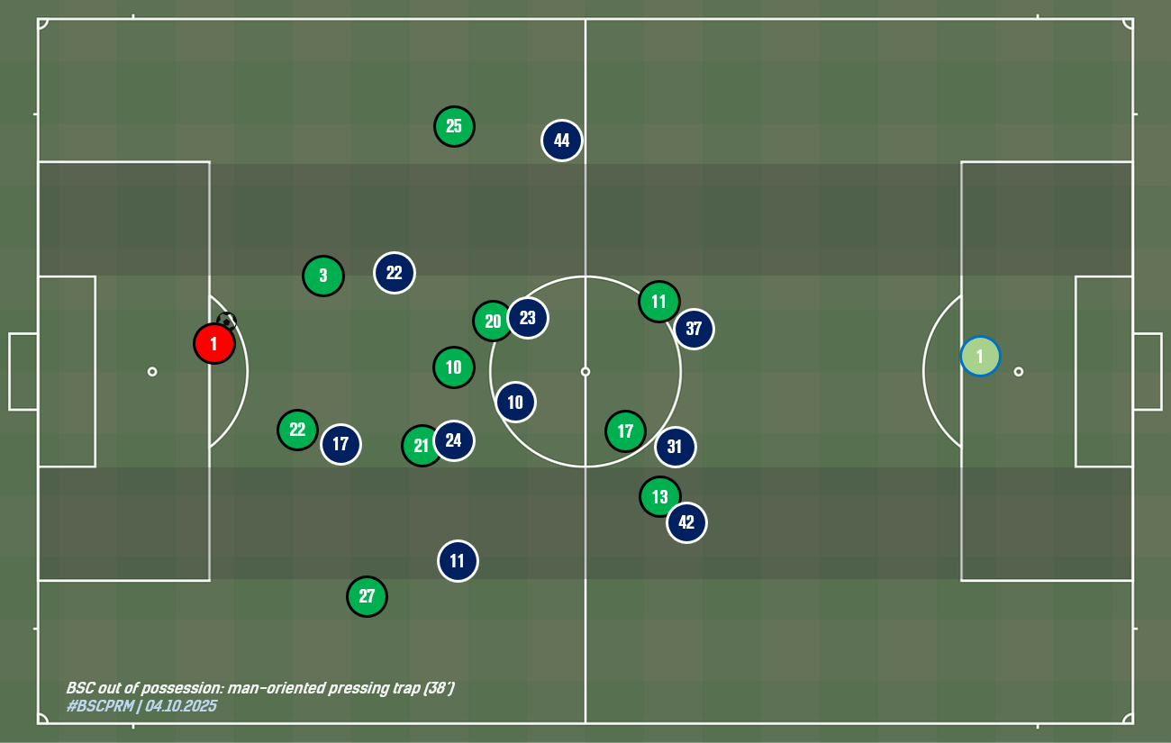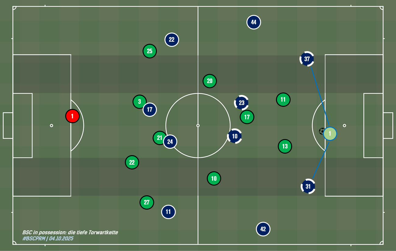 이번 시즌, SC 프로이센 뮌스터는 알렉산더 엔데 감독 아래서 공 점유율과 짧은 패스 시도 부문, 대회 최상위권을 달리며, 이전까지와 완전히 달라진 전술적 주안점을 보입니다. 헤르타 BSC는 이미 지난 8월 18일, DFB-포칼 첫 번째 단계, 뮌스터 방문 경기에서 여기에 혼쭐이 났습니다. 120분 동안 실점하지 않고 버텨, 승부차기 끝에 어렵게 극복해 냈지만, 토니 라이스트너는 당시, 마치 FC 바르셀로나와 경기하는 듯한 압박감을 받았다고 토로했습니다. 안방에서 똑같은 졸전을 되풀이하지 않으려, 이날, 슈테판 라이틀과 그의 조수들은 명확한 경기 계획을 짜서 나왔습니다. 예상대로 올림피아슈타디온 베를린에서 방문객이 공을 더 자주, 오래 소유한 가운데, 푸르고 흰 유니폼의 헤르타 BSC는 대인 방어 원칙에 기초하여, 높은 지역에서부터 매우 강하게 상대를 압박했습니다. 막시밀리안 엔데 감독의 팀은 공격 기초 작업을 할 때, 우측면 수비수인 야노 테어호어스트가 야니스 호이어와 파울 예켈 오른편에 남아, 변칙적으로 세 명이 일렬로 서는 진을 만들고, 리코 프라이싱어가 그 앞에서 활동하며 공 받을 준비를 했습니다. 테어호어스트의 반대쪽에서는 루카 볼라이가 전진, 왼쪽 옆줄을 밟았으며, 오른쪽 측면으로는 마빈 슐츠가 빠졌습니다. 중앙의 요릿 헨드릭스까지 고려할 때, 숫자로 단순화한다면, 골키퍼부터 13412 형태로 설 수 있었습니다(실제로는 전반전에 슐츠가 매우 공격적으로 올라섰고, 헨드릭스는 반 칸 정도 더 아래로 내려오는 경우가 많았습니다.). 라이틀은 우선, 세바스티안 그뢰닝에게 호이어를 맡겼습니다. 좌우를 서로 자주 바꾼 파비안 레제와 마텐 빙클러가 그뢰닝보다 한 칸 아래 서 있다가, 호이어에게서 옆쪽 동료에게 공이 나가면, 측면에서부터 호를 그리며 테어호어스트/예켈에게 접근, 그다음 전개를 방해했습니다. 중앙에서 프라이싱어는 요운 다구르 소르스테인손이, 헨드릭스는 케네트 아이히호른이, 슐츠는 미카엘 퀴장스가 담당했습니다(그런고로, 공을 상대가 가졌는데도 중앙선 위로 헤르타 BSC 선수 예닐곱 명이 올라서는 일이 예사였습니다.). 무엇보다, 소르스테인손이 프라이싱어를 꽁꽁 묶어, 베를린 노파의 이와 같은 팀 단위 압박을 이겨내기 힘겨워 한 SC 프로이센 뮌스터는 헨드릭스가 프라이싱어의 왼편으로 내려가, 숫자를 더하는 장면이 많았습니다. 간혹, 올리버 바티스타 마이어까지 프라이싱어의 오른쪽으로 내려오기도 했는데, 이러면, 이들이 자랑하는 최고의 무기, 그 위력이 떨어질 수밖에 없었습니다. 그런데도 여전히, 뒤쪽에서 공 순환에는 어려움을 겪었습니다. 하는 수 없이, 우측면으로 돌아서 나간 슐츠에게 공을 보내, 그쪽을 공략해 보려 하거나, 아예, 최전방 두 명, 라스 로코치와 오스카르 빌헬름손에게 길게, 수직 연결을 자주 시도했습니다. 슐츠의 위협이 실재적이지 않으면, 데요바이시오 제이파위크까지 안쪽으로 좁혀서 토니 라이스트너, 다르더이 마르톤을 지원했으므로, 길게 넘어오는 공에 대해서도 다만, 헤르타 BSC가 잘 준비한 채 막아낼 수 있었습니다. 데요의 존재 덕에, 바티스타 마이어가 아이히호른과 퀴장스 뒤에서 공을 잡으려 하면, 마르톤이 그에게 달라붙어서 괴롭히는 경우도 때로 보였습니다.