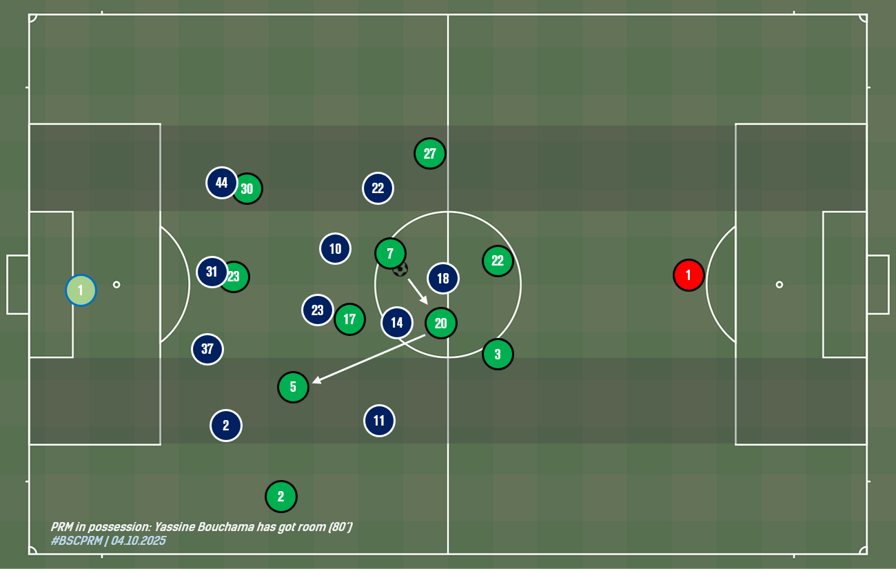 미길 키르게스코우가 팀이 뒤쪽에서 공격을 조립할 때, 전임자, 루카 볼라이보다 전체적으로 덜 높이 올라섰습니다. 그가 '애매한' 높이에서 공을 잡으면, 율리안 아이치베르거가 잘 달라붙지 않고, 뒤쪽에서 동료들과 선을 맞추려는 모습을 보였으니, SC 프로이센 뮌스터는 비교적 자유로운 키르게스코우를 통한 전진을 왕왕 꾀했습니다. 알렉산더 엔데 감독이 마빈 슐츠를 불러들이고, 말리크 바트마즈를 세운 경기 후반부(79')에는 올리버 바티스타 마이어에게 중앙선 위에서 돌아다닐 자유도를 더 주면서, 바티스타 마이어가 왼쪽 절반 공간, 측면, 너른 공간으로 빠져서 숫자를 더하고, 키르게스코우와 협력하여 헤르타 BSC 오른쪽 측면을 공략했습니다. 지친 기색이 역력한 파비안 레제가 전방에서부터 상대 전개를 눌러주지 못했고, 부샤마의 존재로 가운데 묶인 케네트 아이히호른이 바티스타 마이어를 잡겠다고 움직이기도 어려웠으니, 아이치베르거가 수적으로 불리한 장면이 연출됐습니다. 후반 37분경 터진 방문객의 경기 유일한 골, 에티엔 아메니도의 골도 (아메니도가 페널티 구역 밖에서 워낙 공을 잘 감기도 했지만) 이와 같은 상황에서부터 나왔습니다. 방문객이 어느 정도 '틈'을 찾은 듯했으나, 슈테판 라이틀도 손 놓고 당하고만 있지는 않았습니다. 레제가 더는 파울 예켈을 적극적으로 압박하지 않았습니다. 대신, 중앙선 아래로라도 내려가서 숫자를 더해, 이쪽이 상대의 '놀이터'가 되지 않도록, 아이치베르거의 부담을 일부 줄여 주었습니다. 추가시간에 돌입한 뒤(92')로는 아껴두었던 마지막 교체 권리를 활용, 레제를 몇 분 일찍 쉬게 하고, 케빈 제사를 투입했습니다. 제사가 보리스 마무자 룸의 왼쪽으로 들어갔고, 미카엘 퀴장스가 위로 올라서며, 모리스 크라텐마허가 레제가 서던 우측면으로 이동했습니다. 추가시간이 기본적으로 육 분이나 주어졌고, 실제로 육 분이 다 지나고도 경기를 관장한 루카스 베넨 주심이 바로 호루라기를 불지 않았으니(거의 이 분 정도를 더 줬습니다.), 제사가 잔디를 밟은 시간이 아주 길지는 않았어도, 그의 임무는 막중했다고 할 수 있습니다.